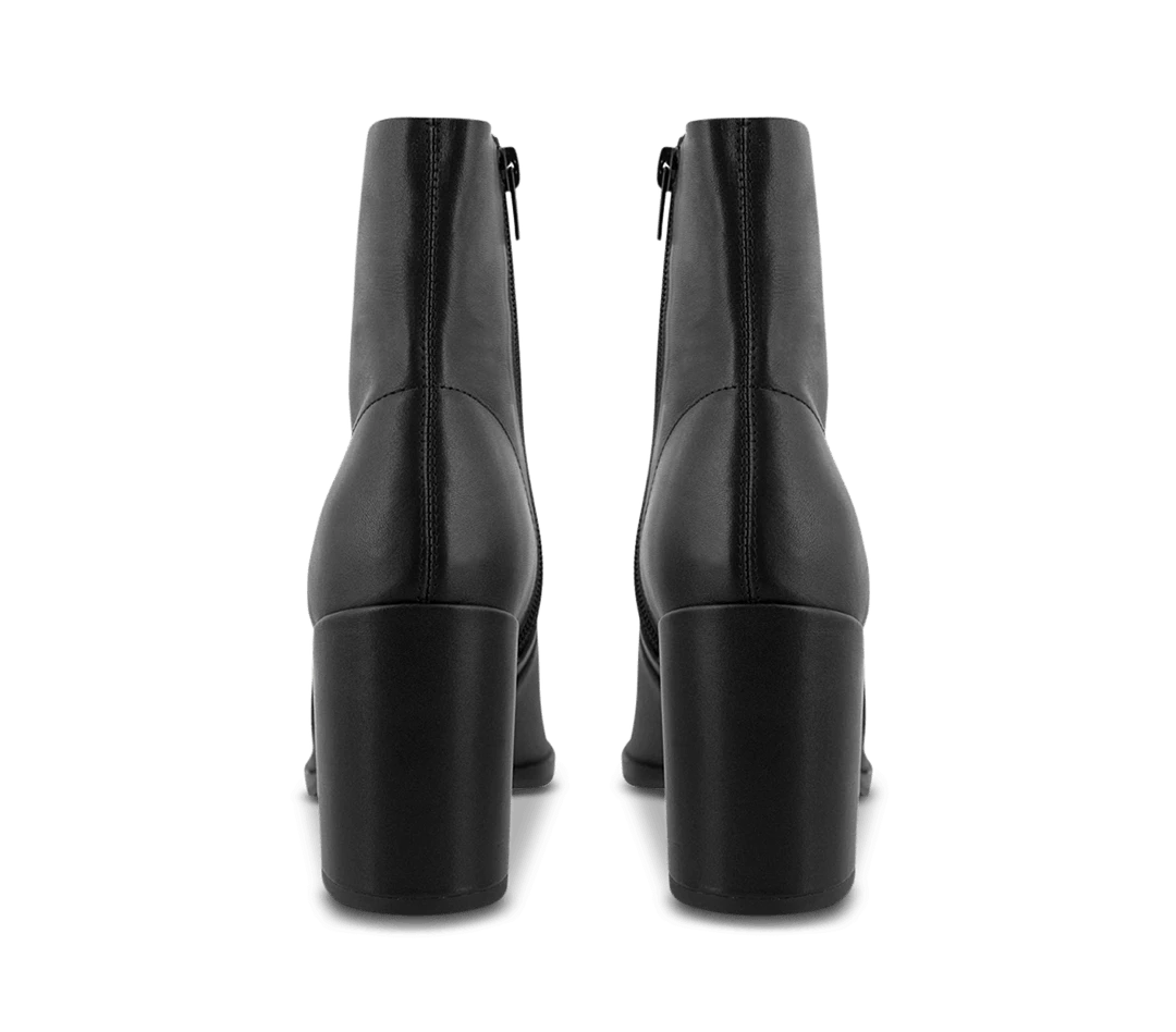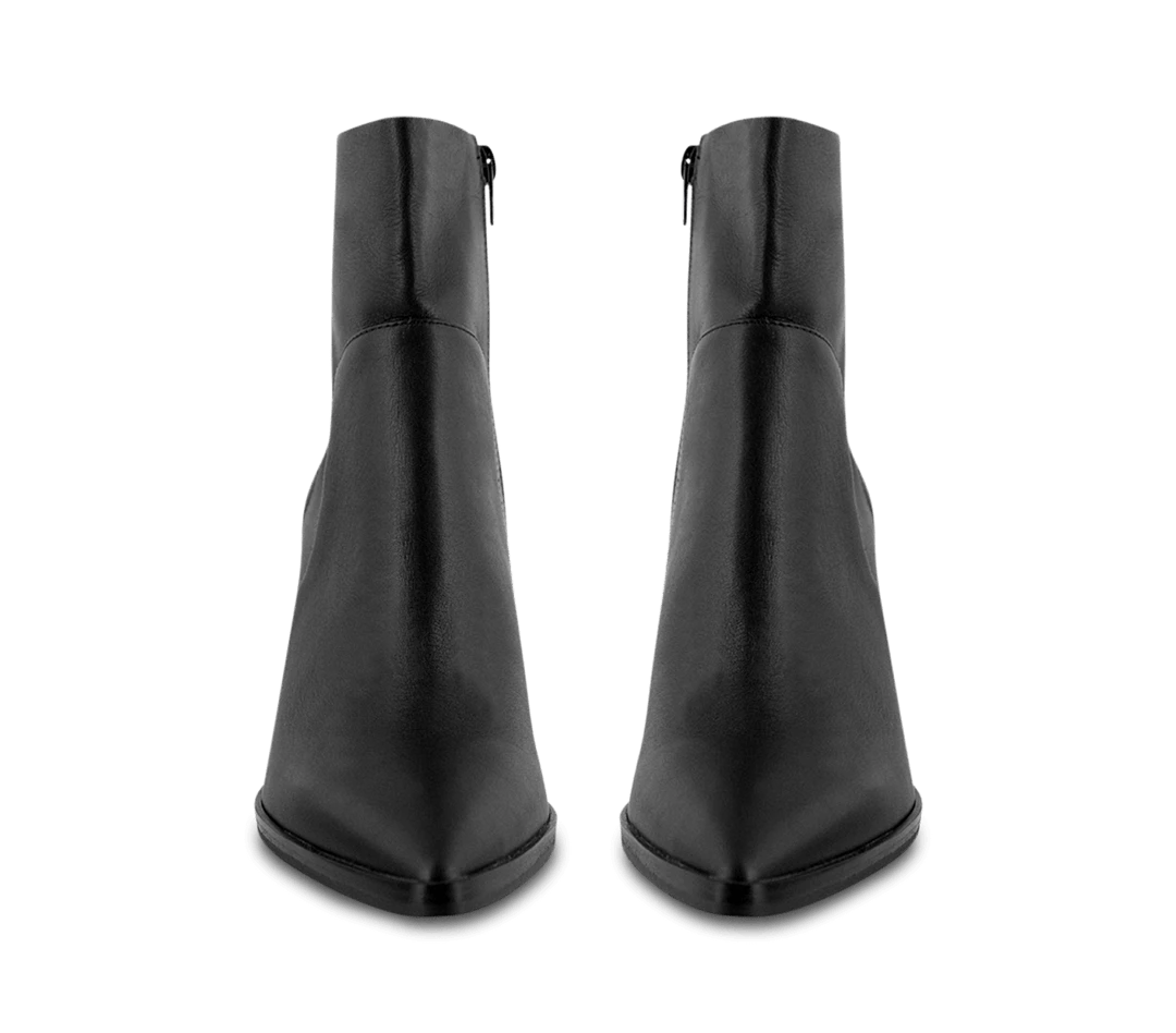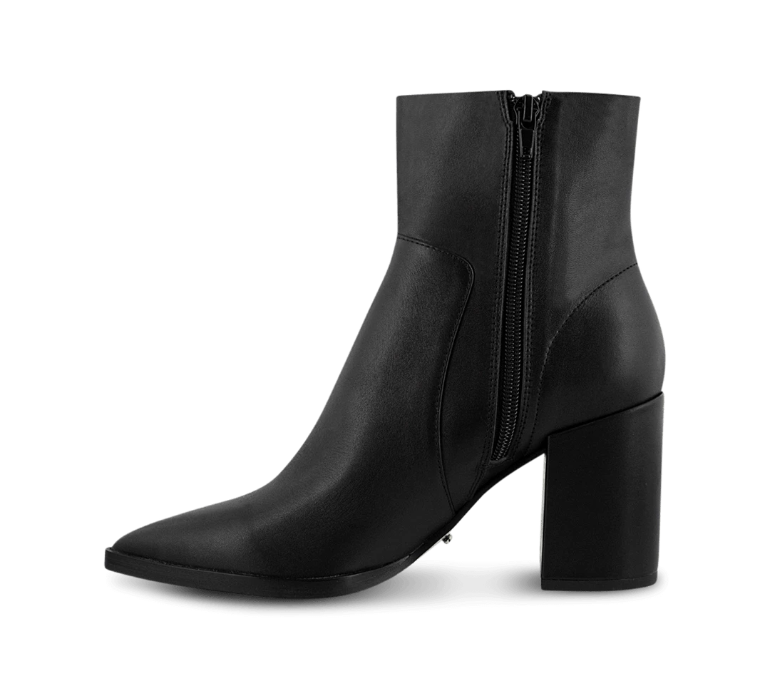 A black leather pointed toe ankle boot with a covered block heel.