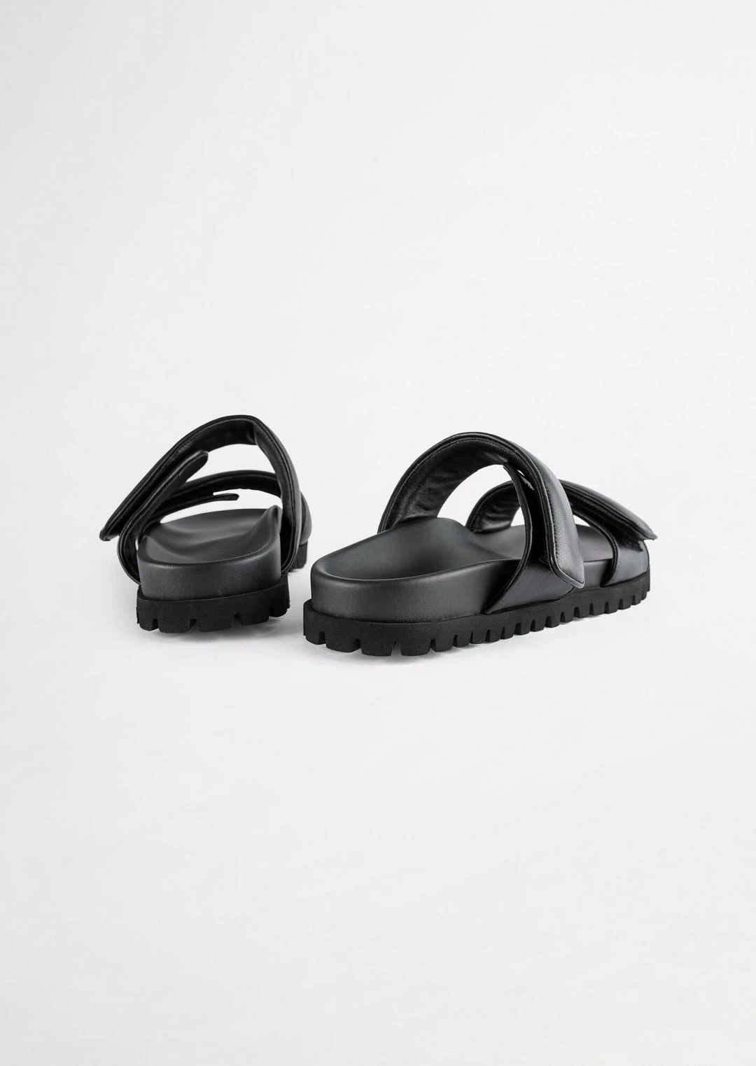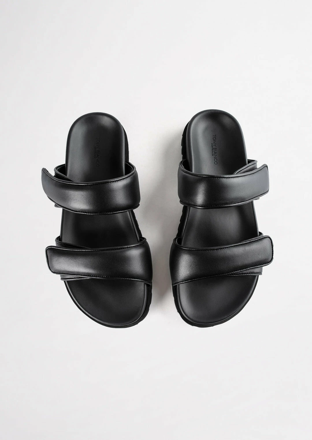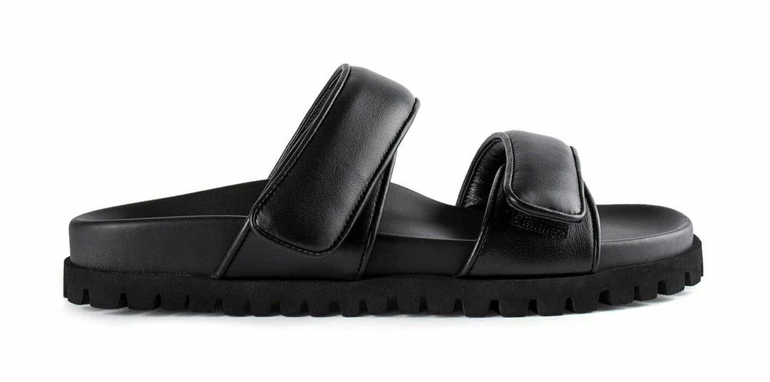 The Bonny slides in genuine black leather are a winning combination of fashion-forward and comfortable. Featuring soft padded leather velcro straps sitting on top of an elevated platform foot bed. You can thank us later.