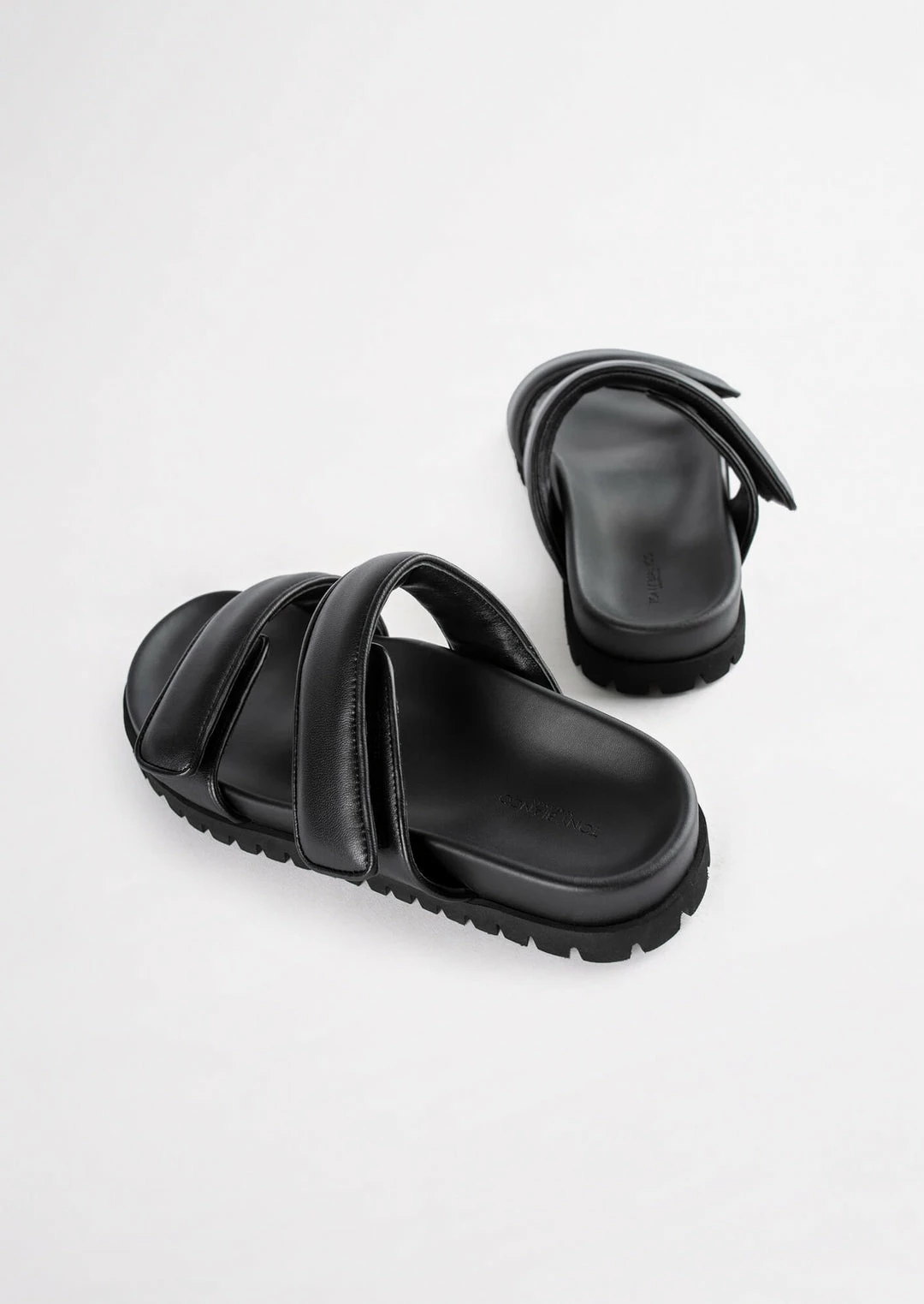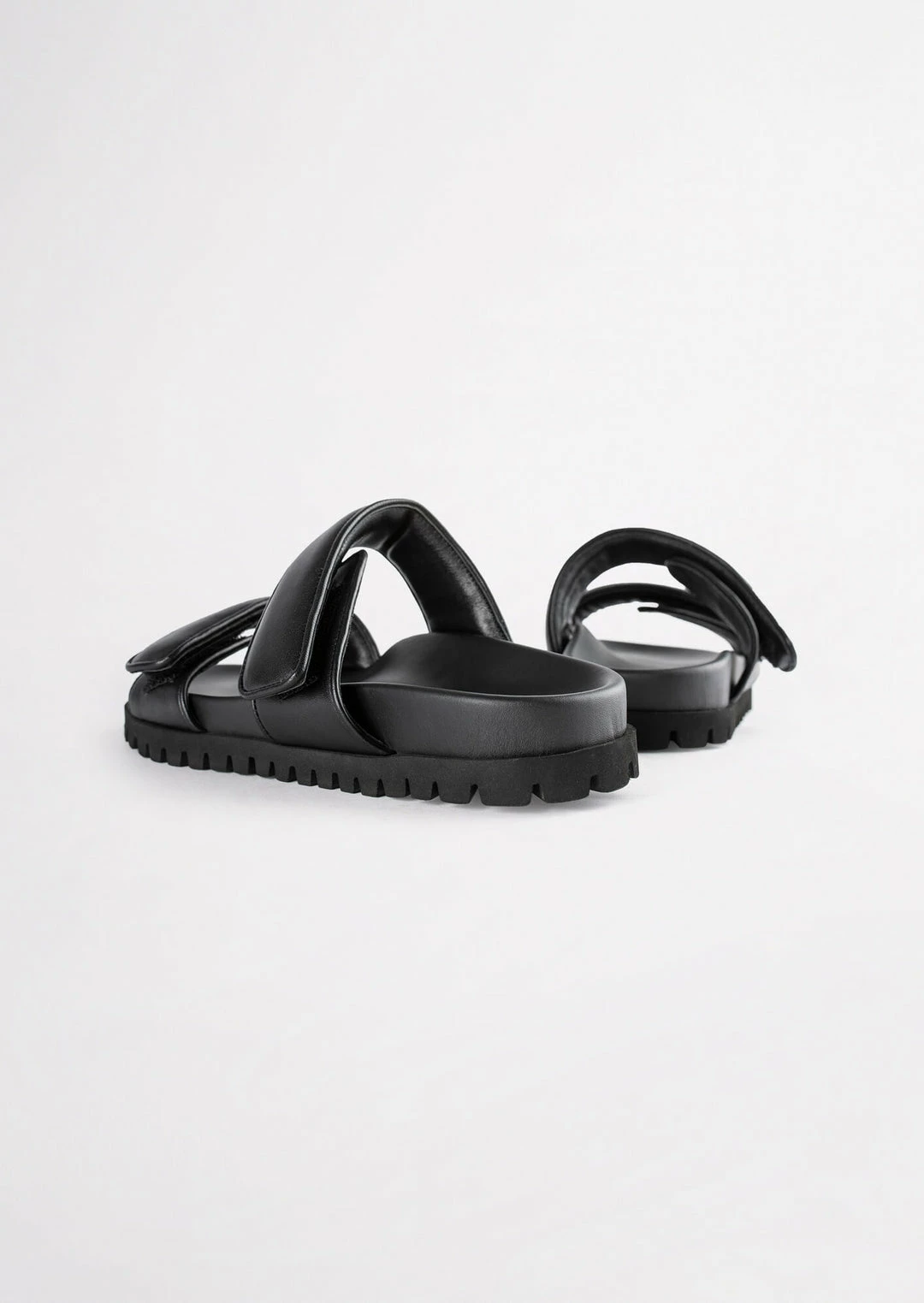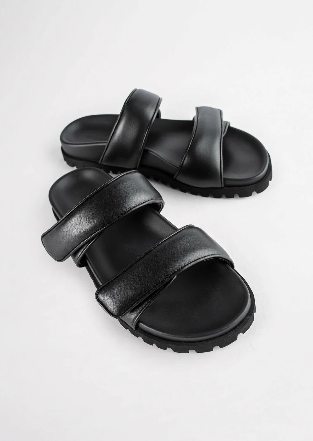 The Bonny slides in genuine black leather are a winning combination of fashion-forward and comfortable. Featuring soft padded leather velcro straps sitting on top of an elevated platform foot bed. You can thank us later.