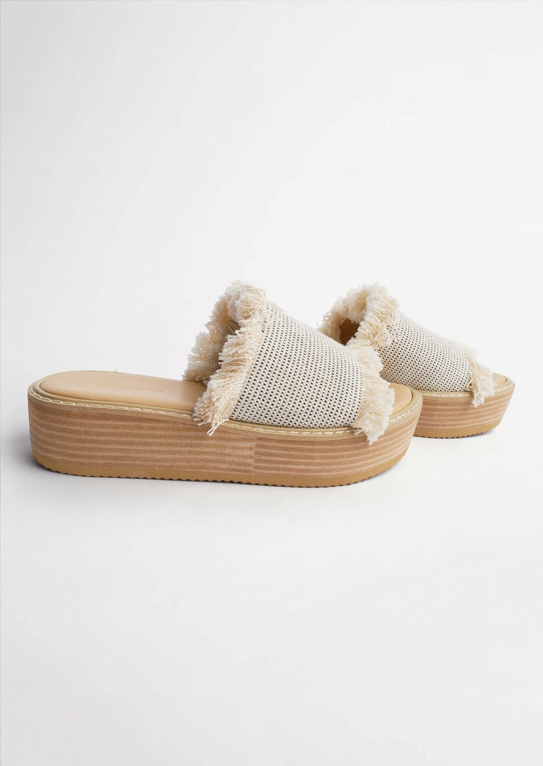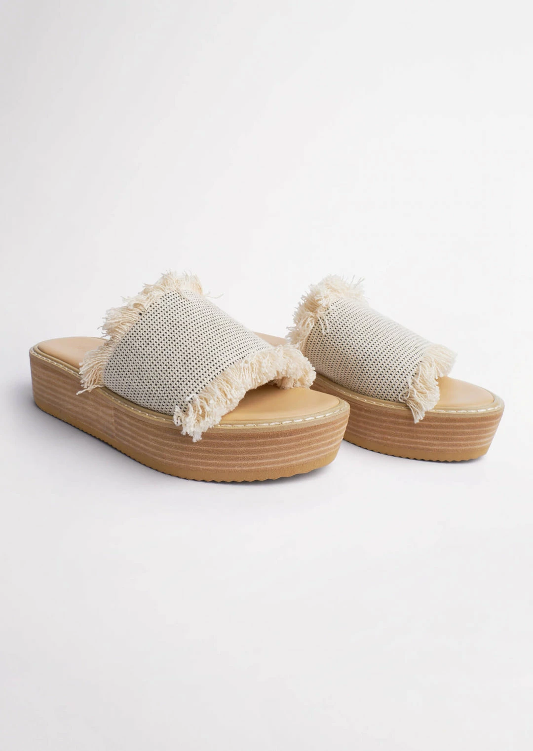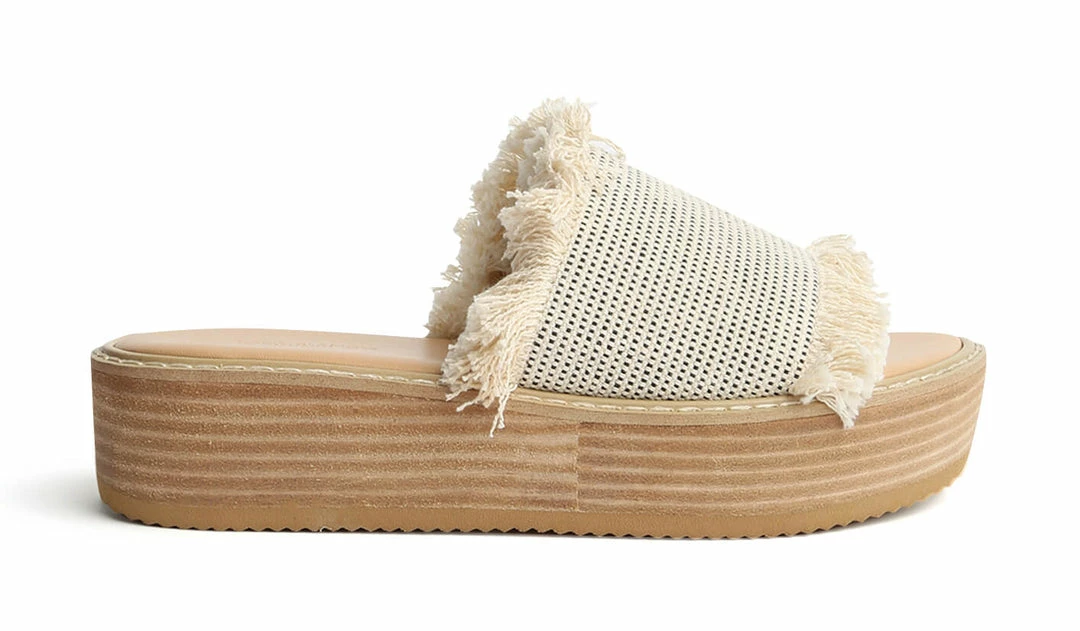 Slip into elevated comfort with the Ebony sandals. Showcasing a textured white and black cotton fringed upper with an open rounded toe and a platform sole.