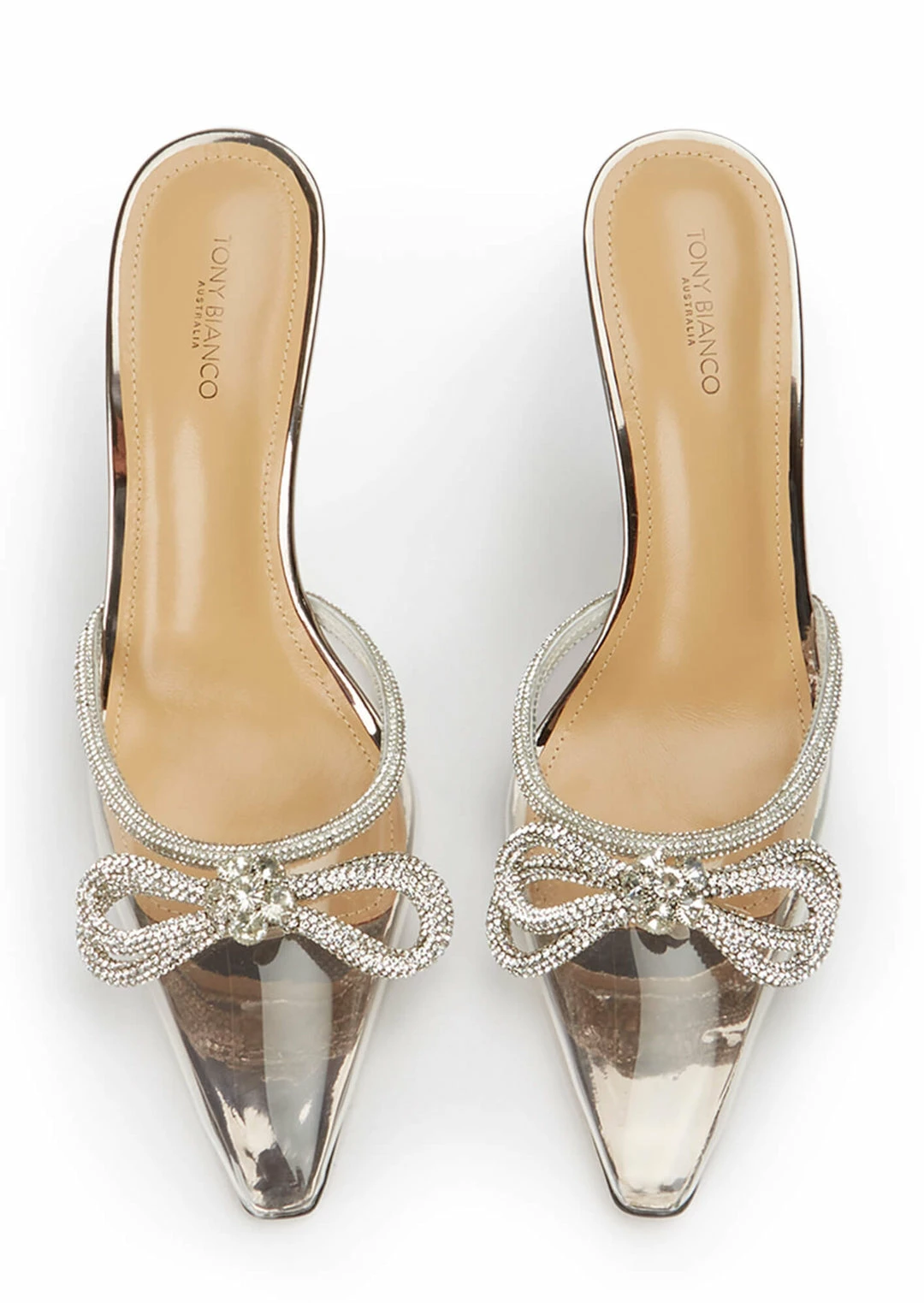 It’s meant to bling with the iconic Ellen clear heels. This eye-catching stiletto mule is adorned with a diamante bow detailing and elongated pointed-toe, providing effortless sophistication to any outfit.