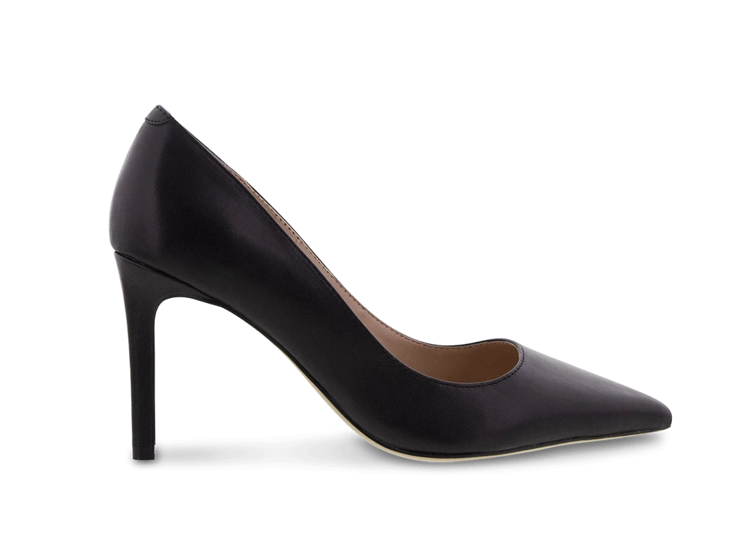 A smooth black leather pointed toe pump with a mid-height stiletto heel. – Leather upper and lining – Long pointed toe shape – Stiletto heel Heel Height: 8.5cm