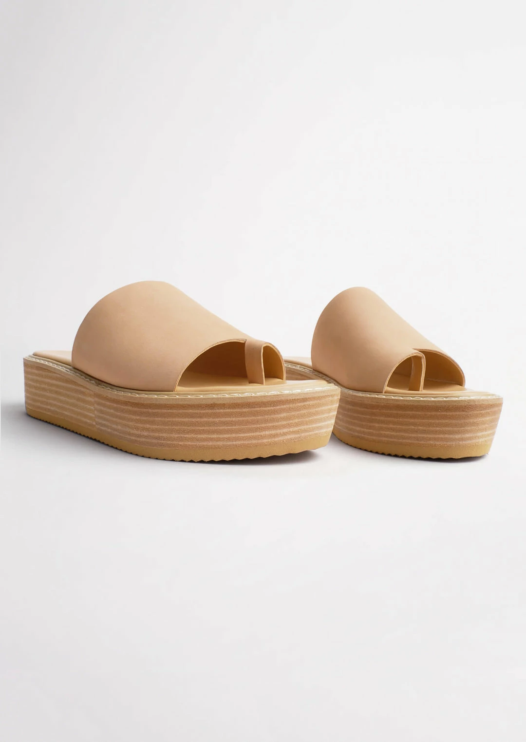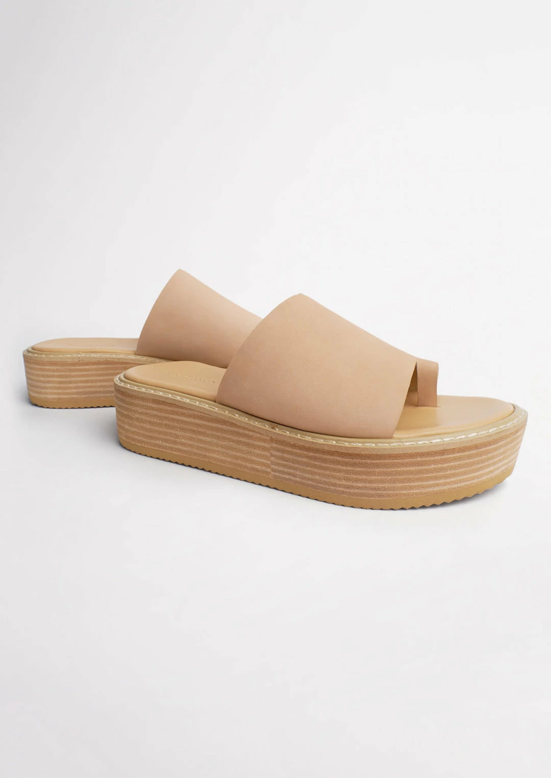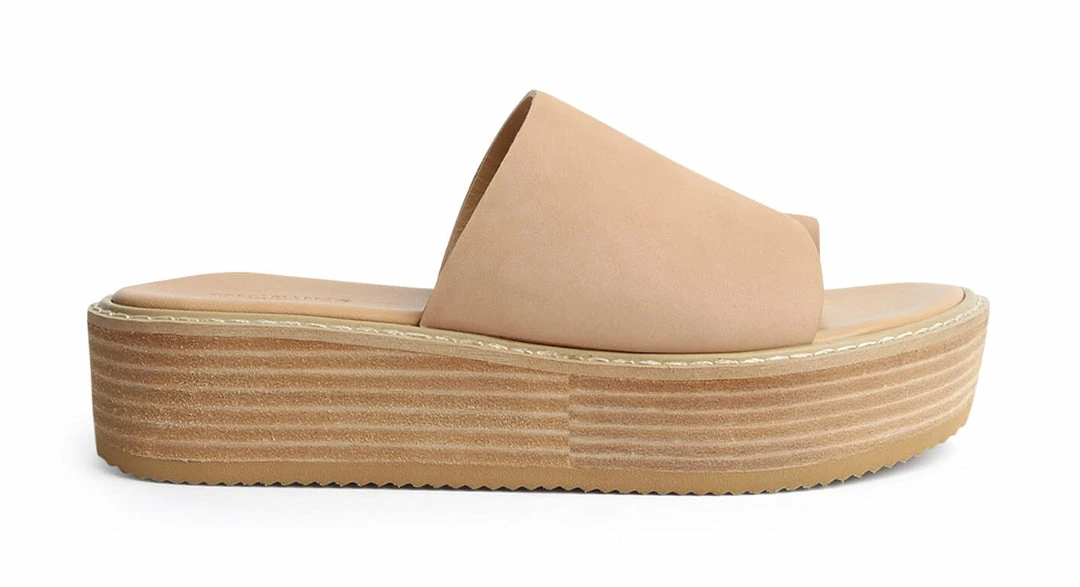 Say hello to comfort! The Energy sandals feature a neutral leather slip on sandal with a ring peep-toe with a rounded toe-shape and an exposed wooden flatform.