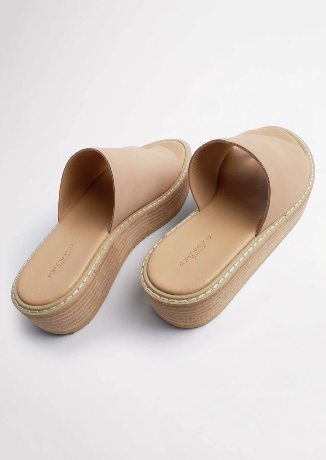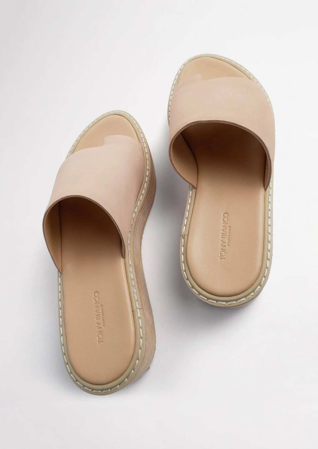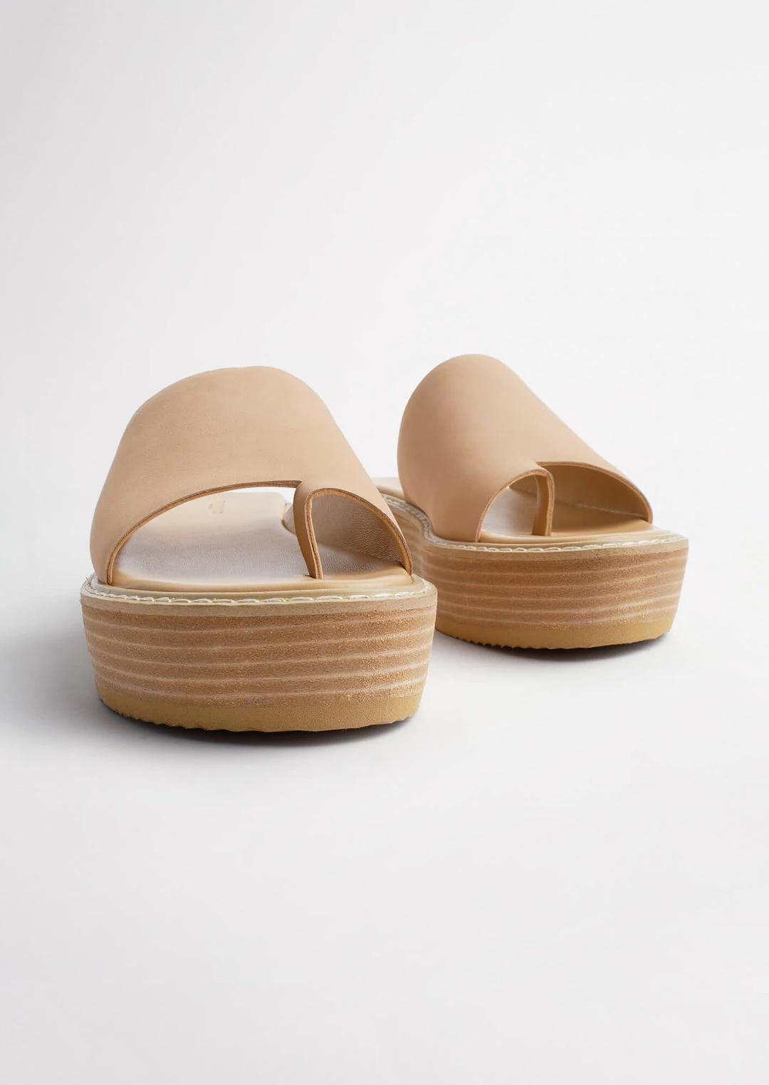 Say hello to comfort! The Energy sandals feature a neutral leather slip on sandal with a ring peep-toe with a rounded toe-shape and an exposed wooden flatform.