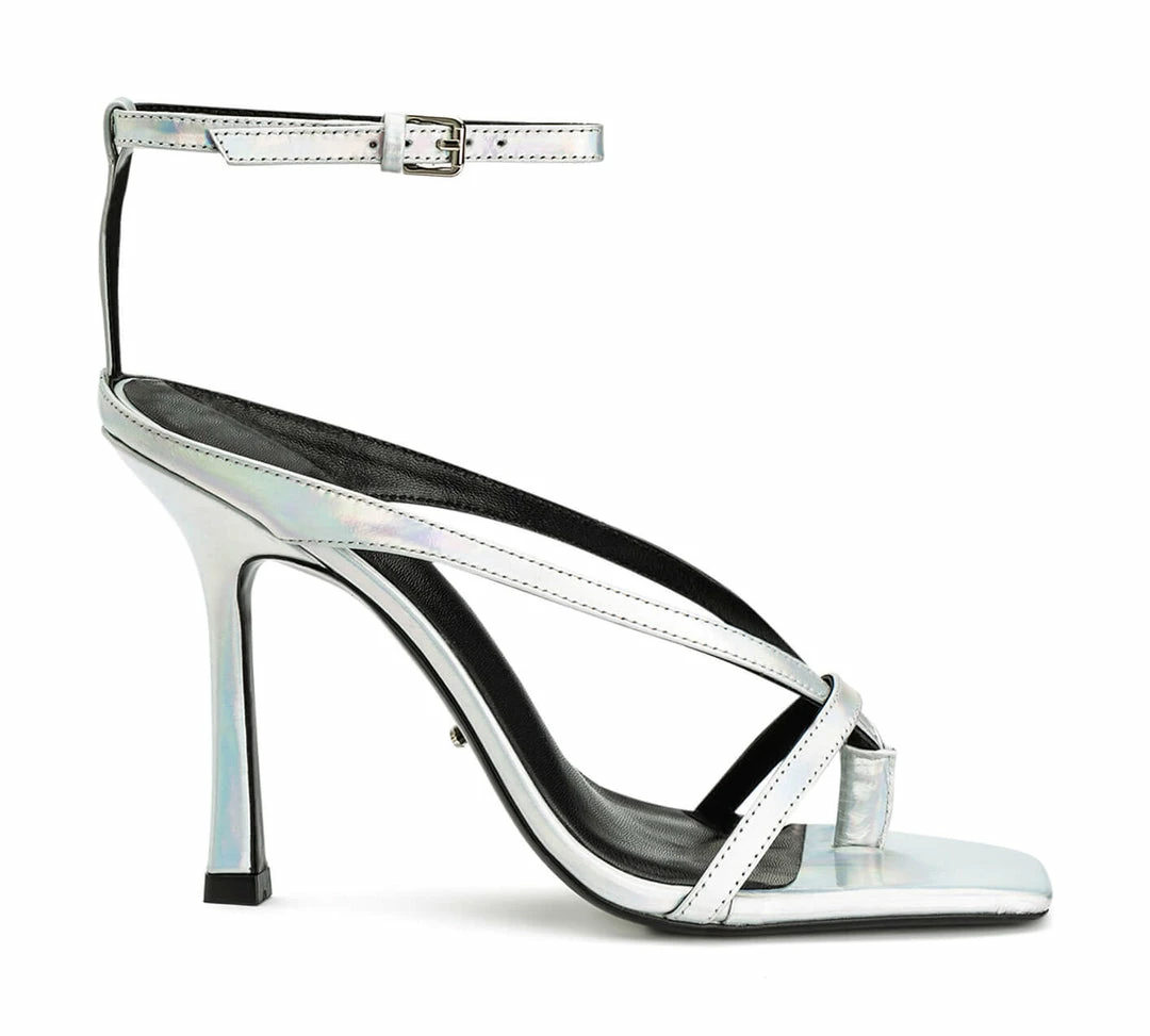 Everyone loves a metallic heel. Meet our Faythe strappy heel in our newest colour, silver illumine. Featuring flattering foot framing straps, an on-trend squared toe-shape, a secure silver buckle and an ultra high 11cm stiletto heel.