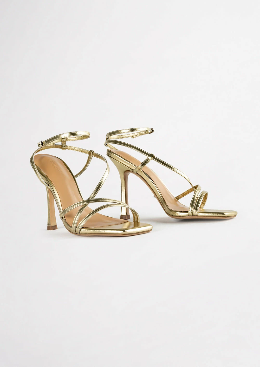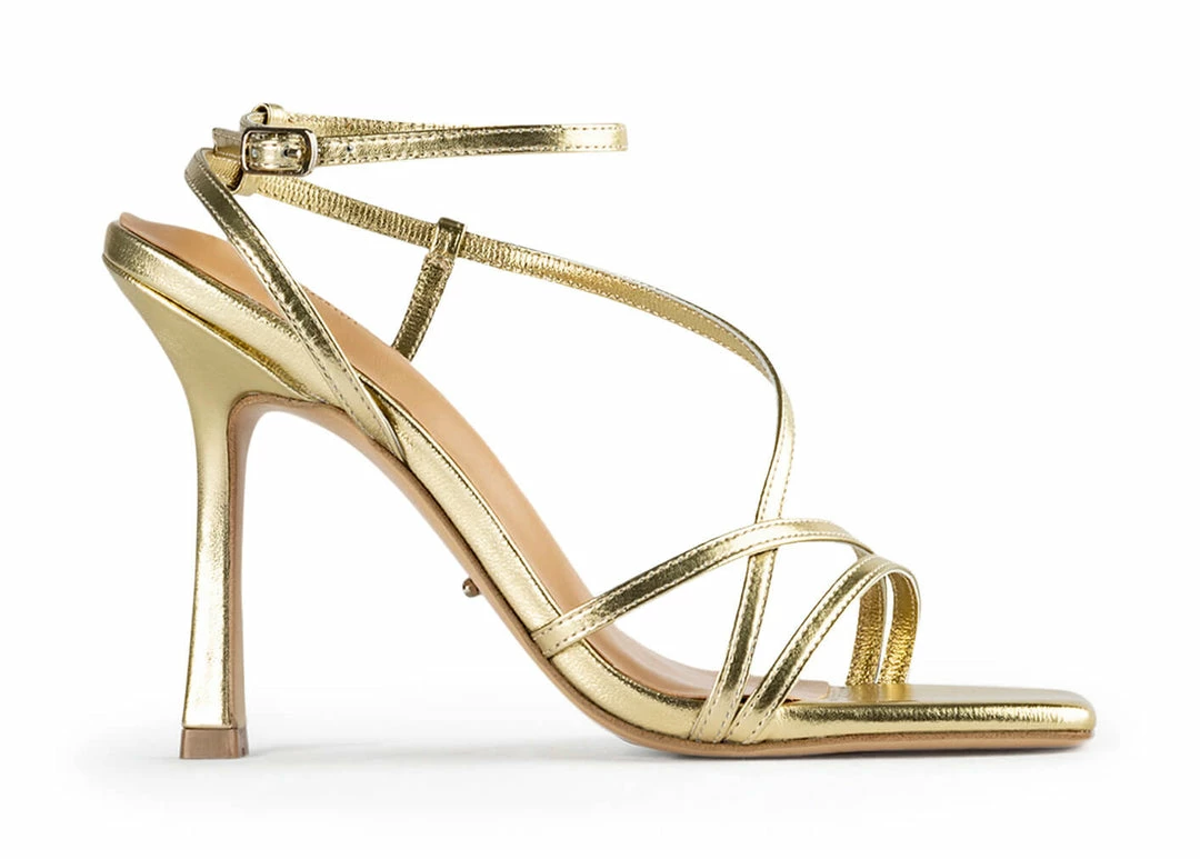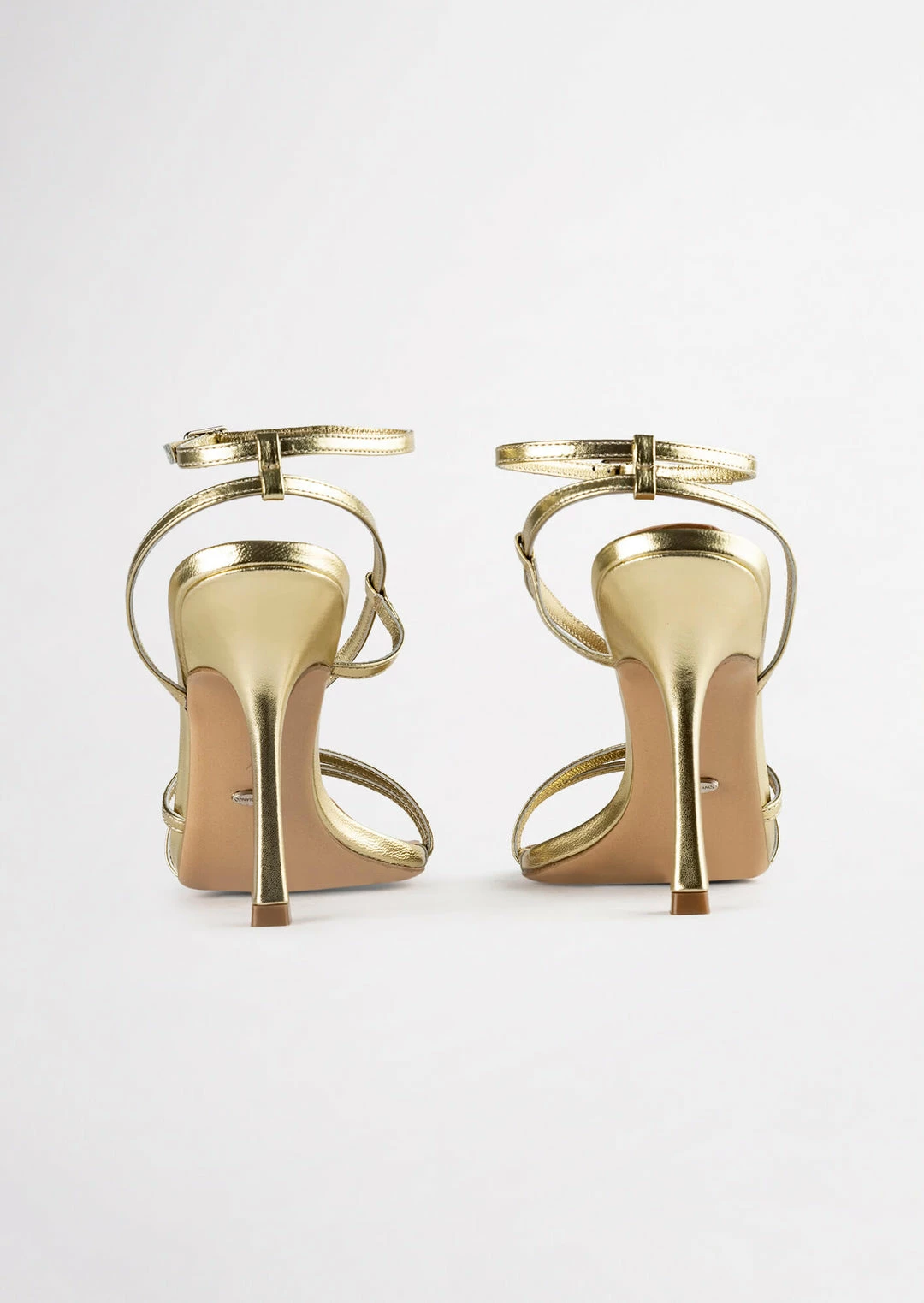Complete your party look with some metallic shine. Introducing the Franci heel in gold nappa – encased with thin, slimming straps, this design features an on-trend squared toe-shape, a padded foot-bed for extra comfort, wrap-around ankle straps and is finished with a silver toned buckle. Set atop a 10.5cm stiletto heel.