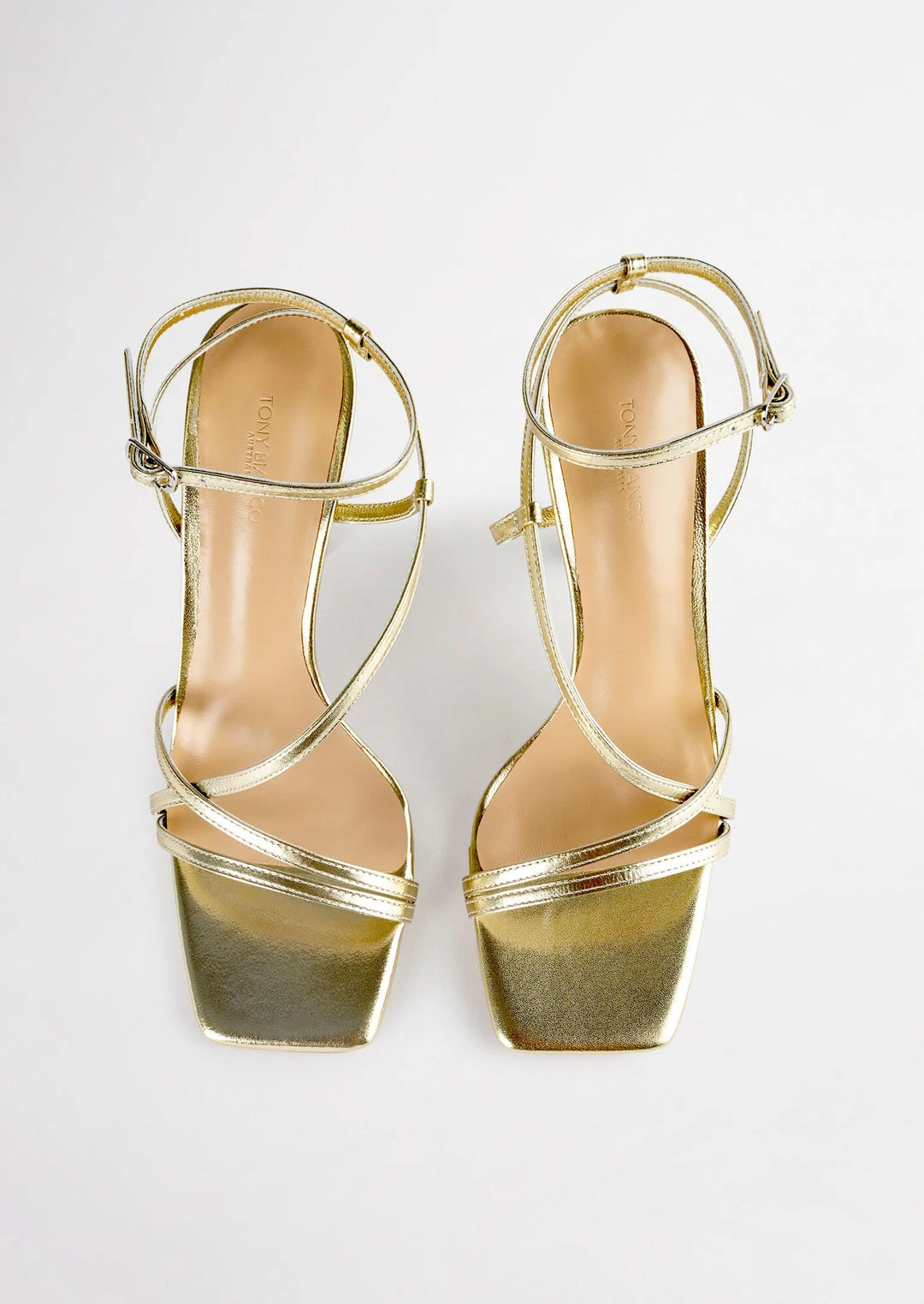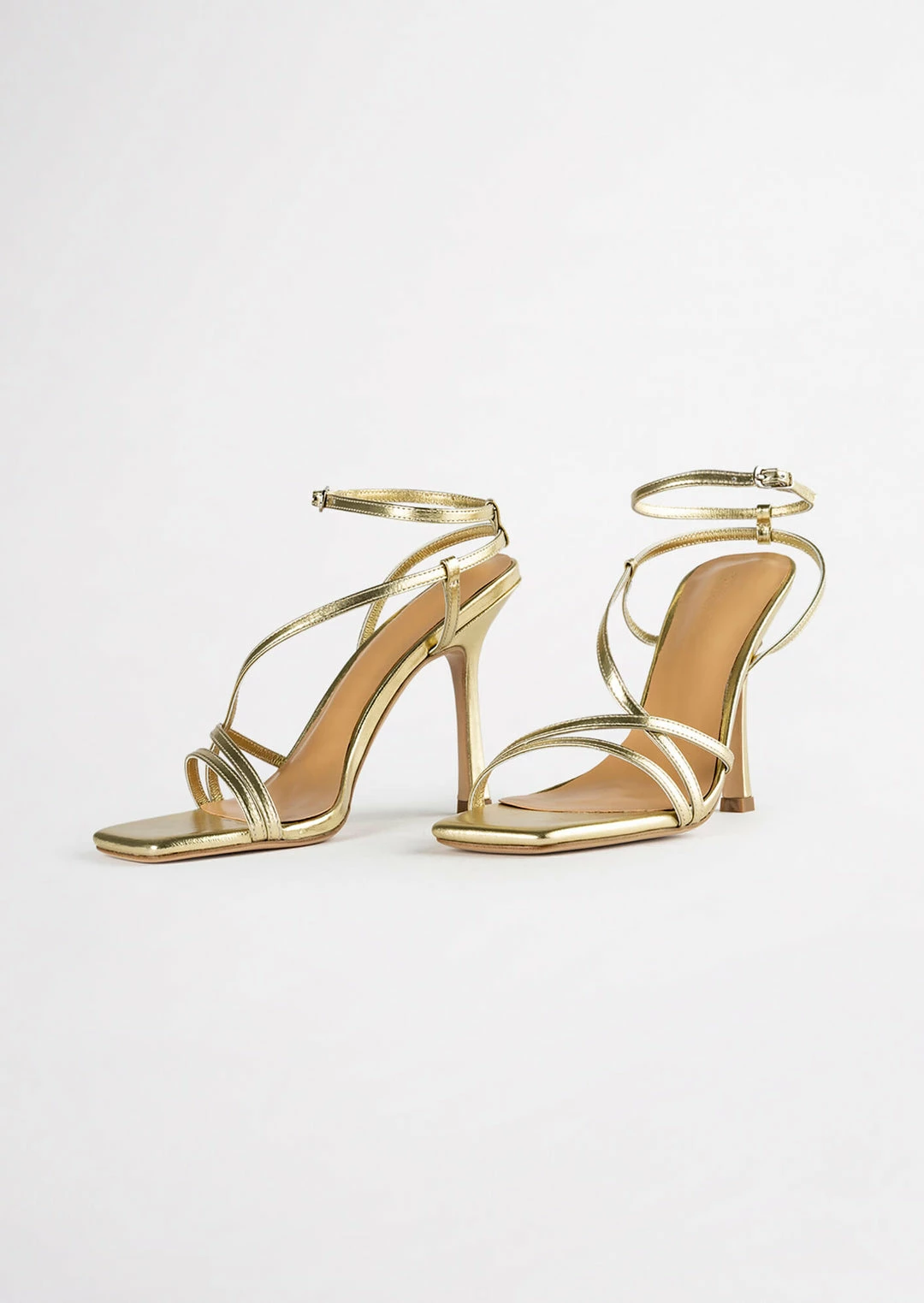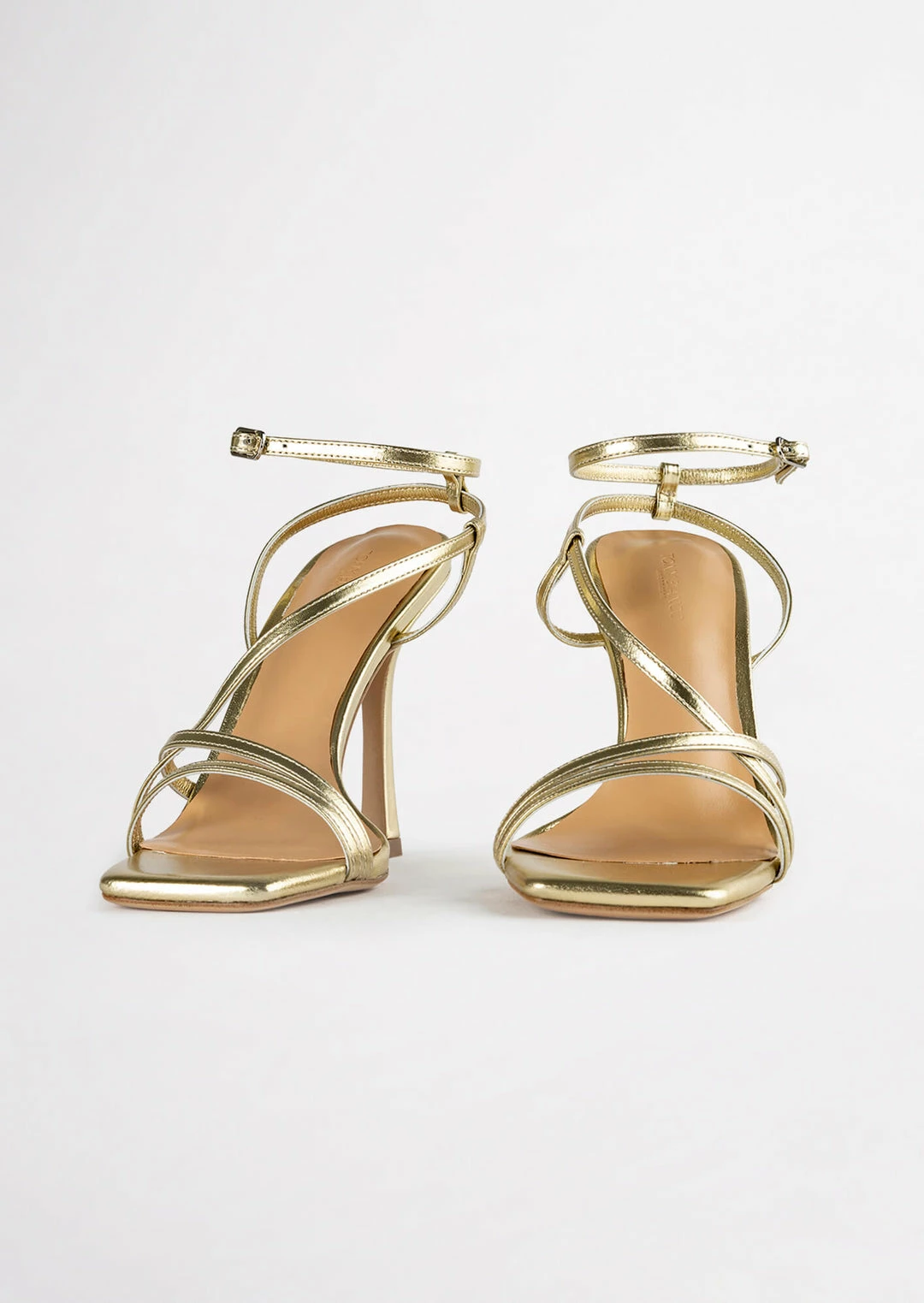 Complete your party look with some metallic shine. Introducing the Franci heel in gold nappa – encased with thin, slimming straps, this design features an on-trend squared toe-shape, a padded foot-bed for extra comfort, wrap-around ankle straps and is finished with a silver toned buckle. Set atop a 10.5cm stiletto heel.