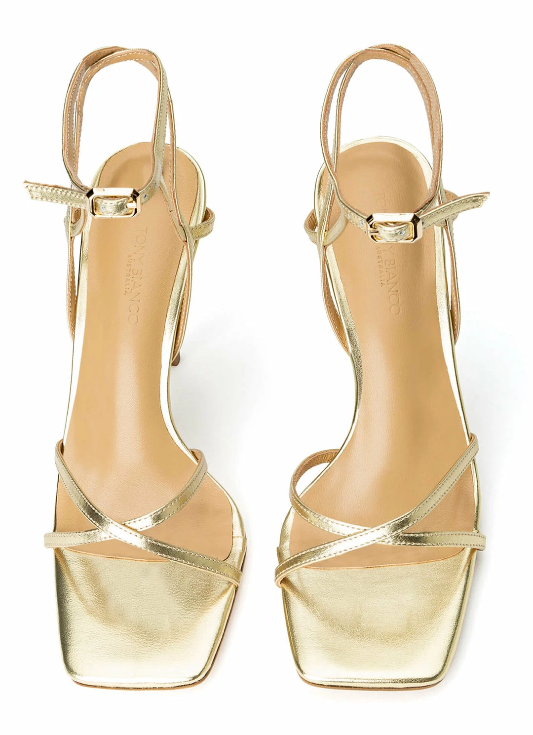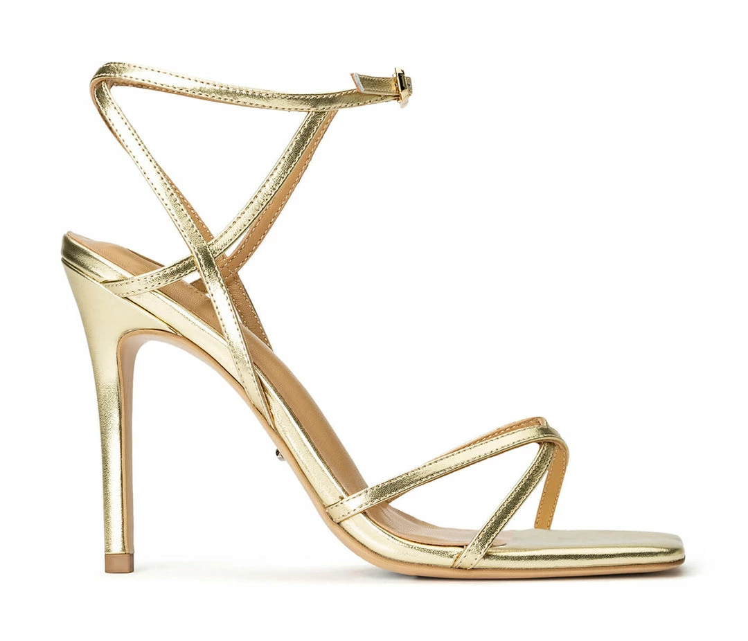 Complete your party look with some metallic shine. Introducing the Frisky heel in Metallic Gold – encased with thin sleek straps, this design features an on-trend squared toe-shape, a padded foot-bed for extra comfort, wrap-around ankle straps and is finished with a silver toned buckle. Set atop a 10.5cm stiletto heel.