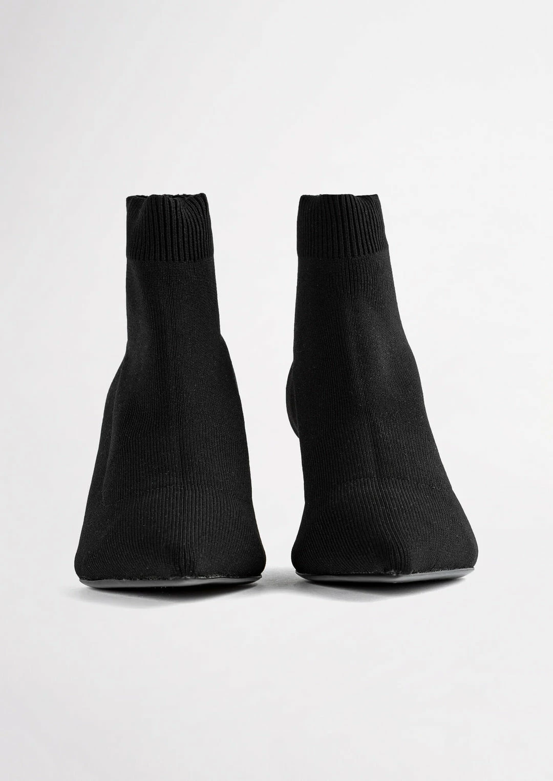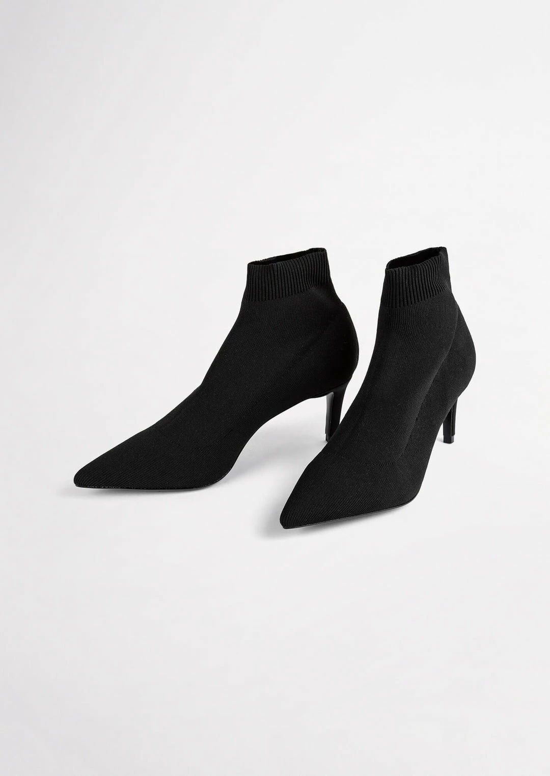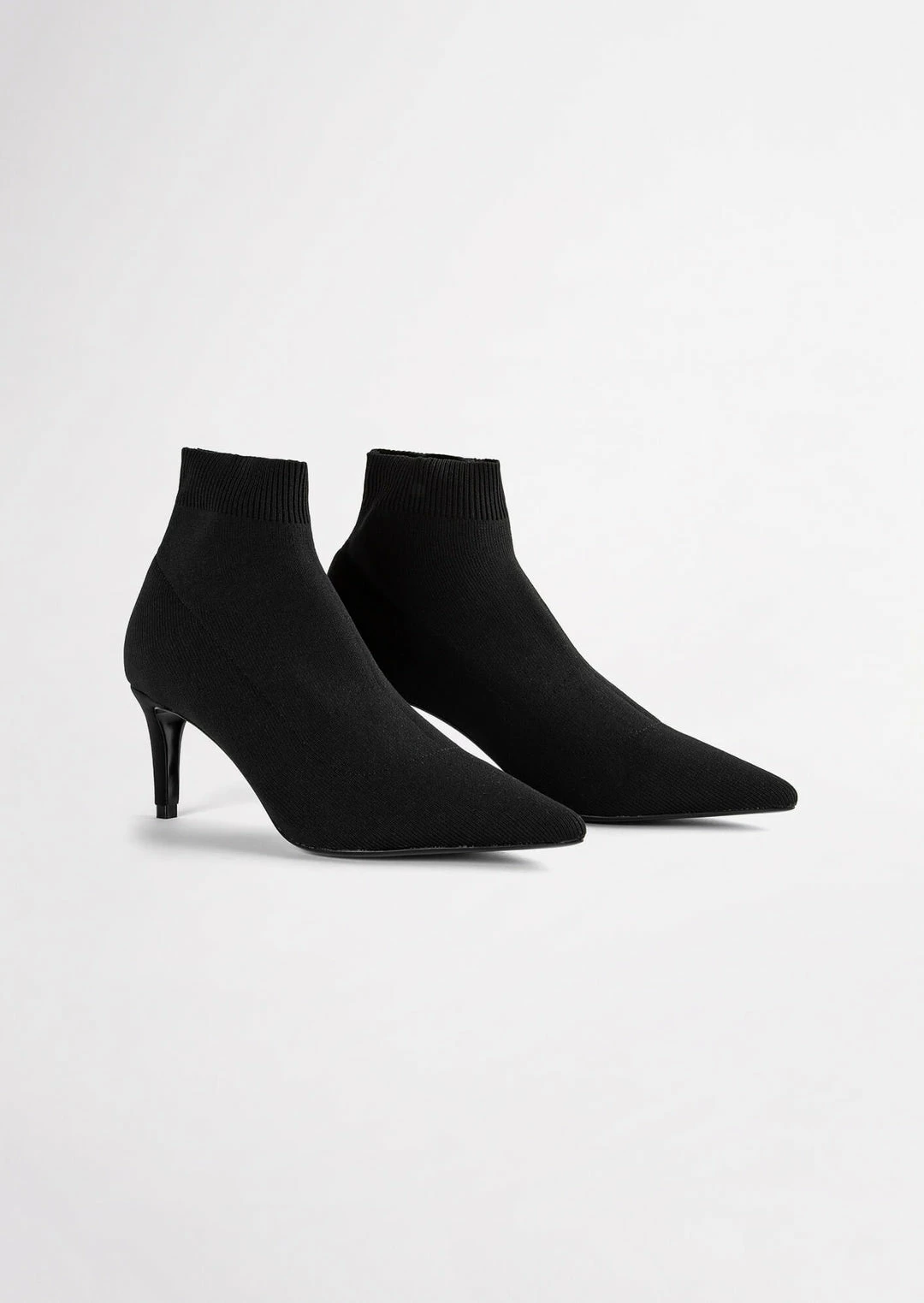 A black sock ankle boot with a pointed toe shape, stiletto heel and textured knitted fabrication.