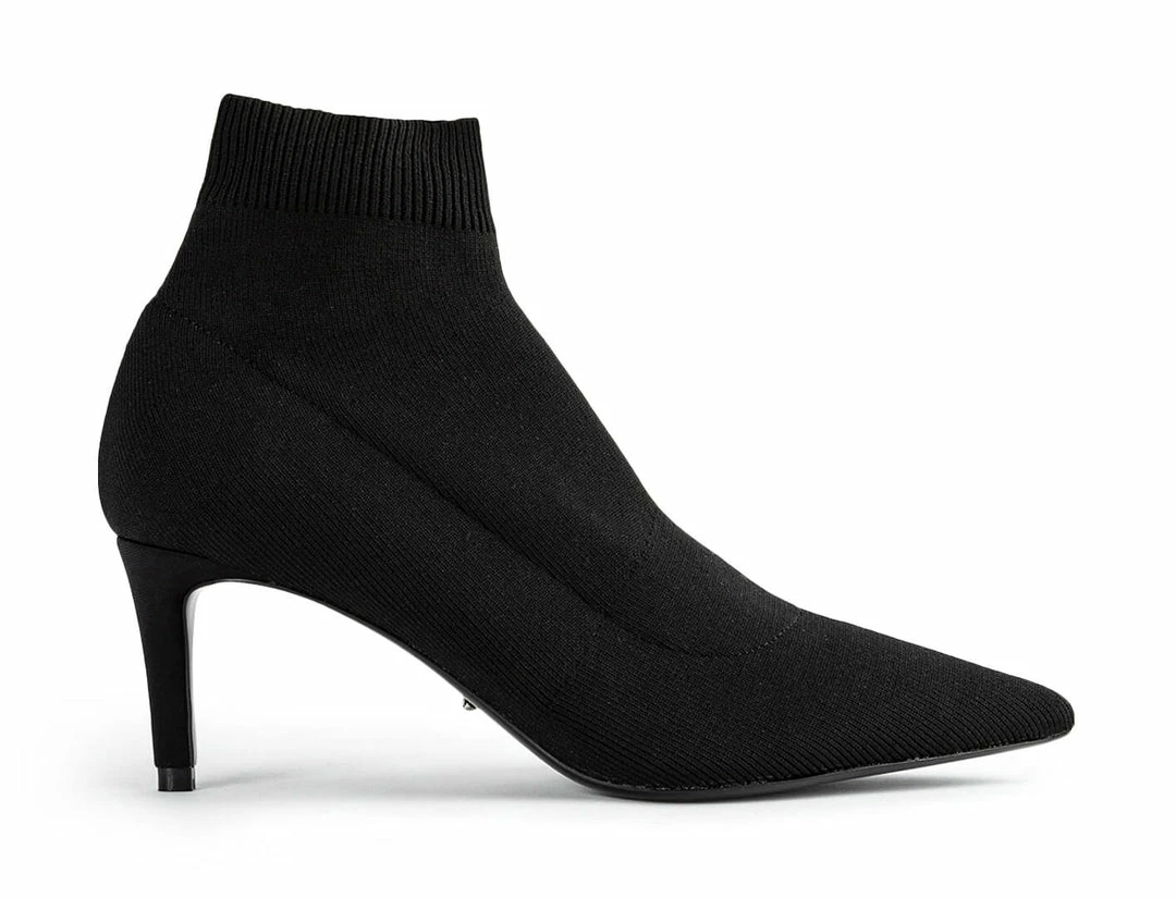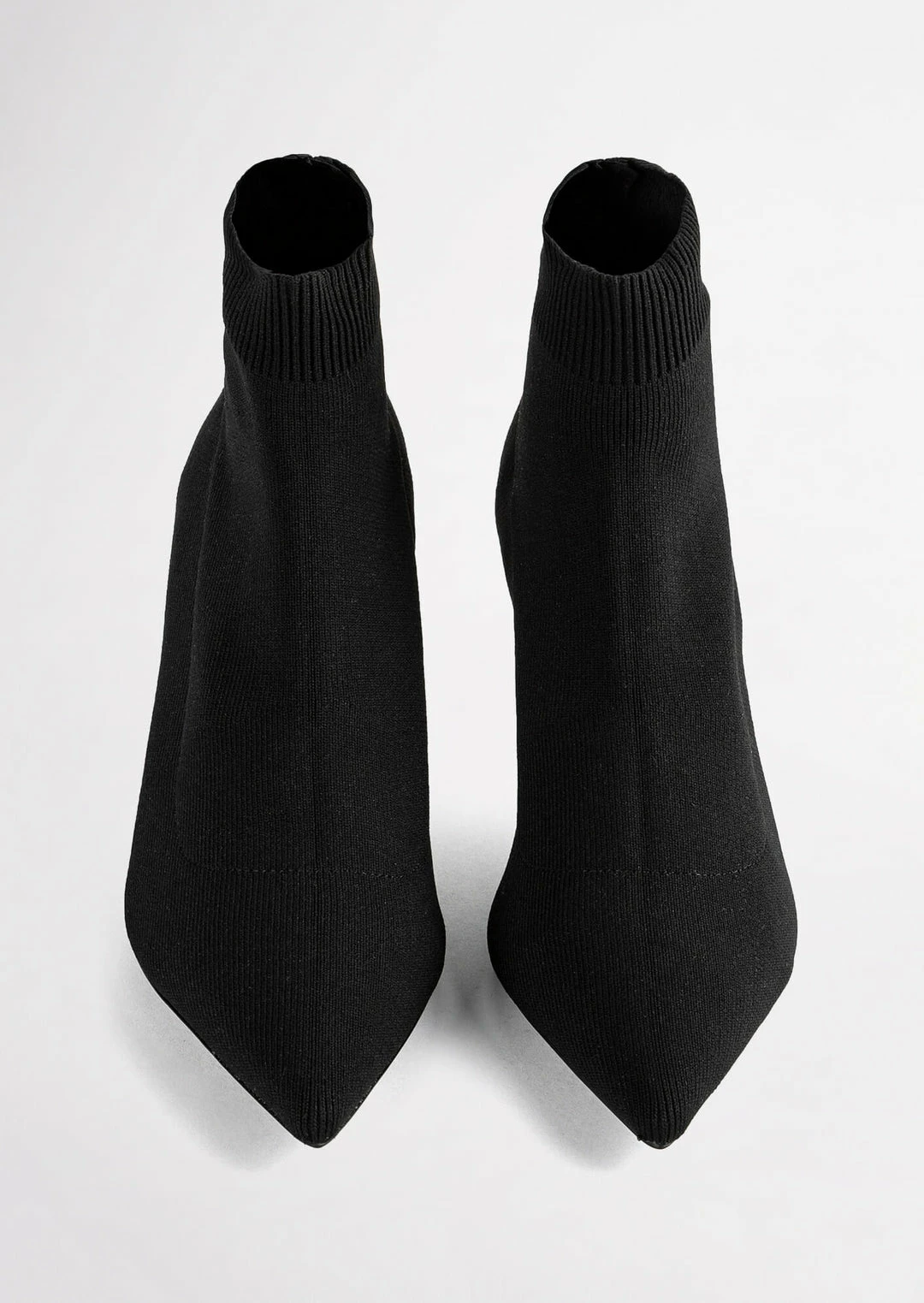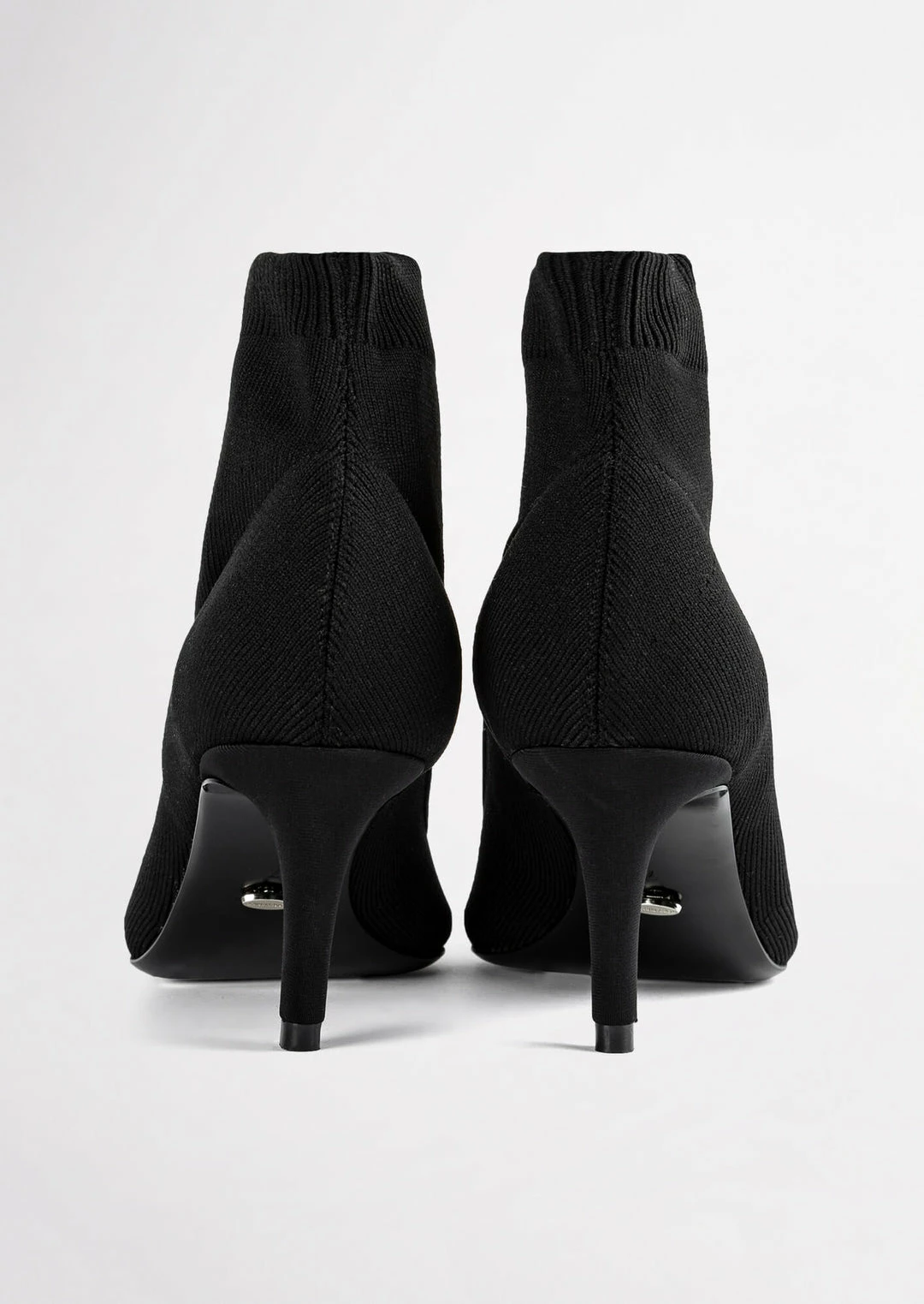 A black sock ankle boot with a pointed toe shape, stiletto heel and textured knitted fabrication.