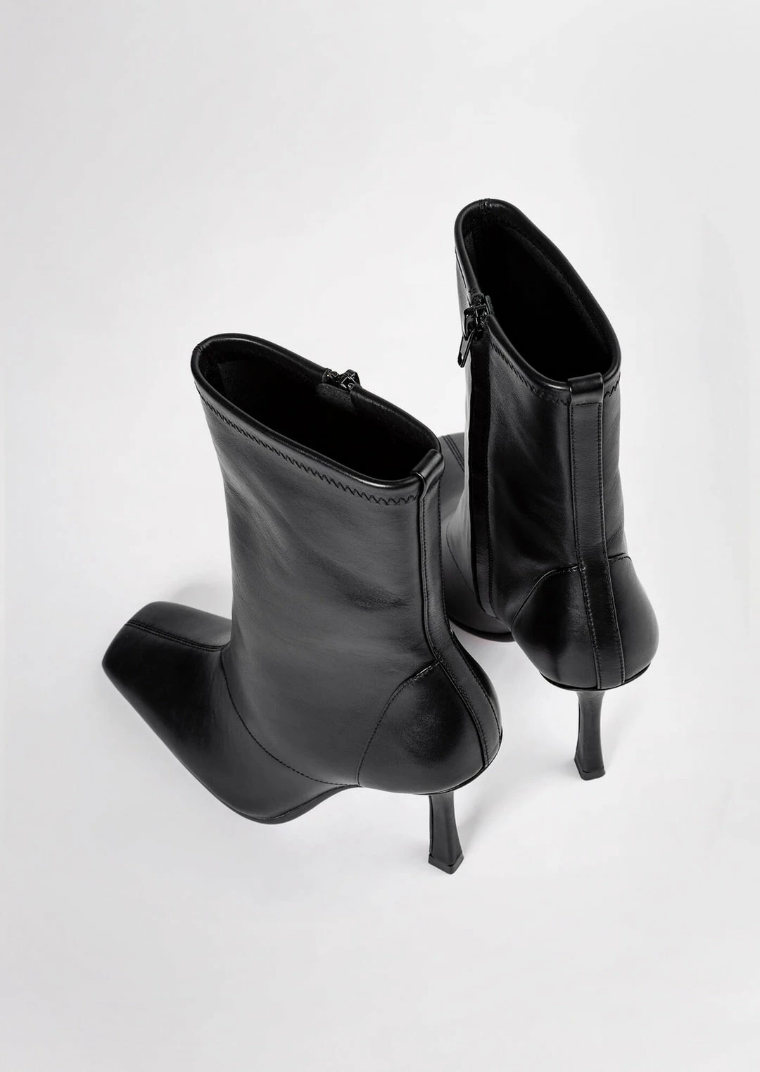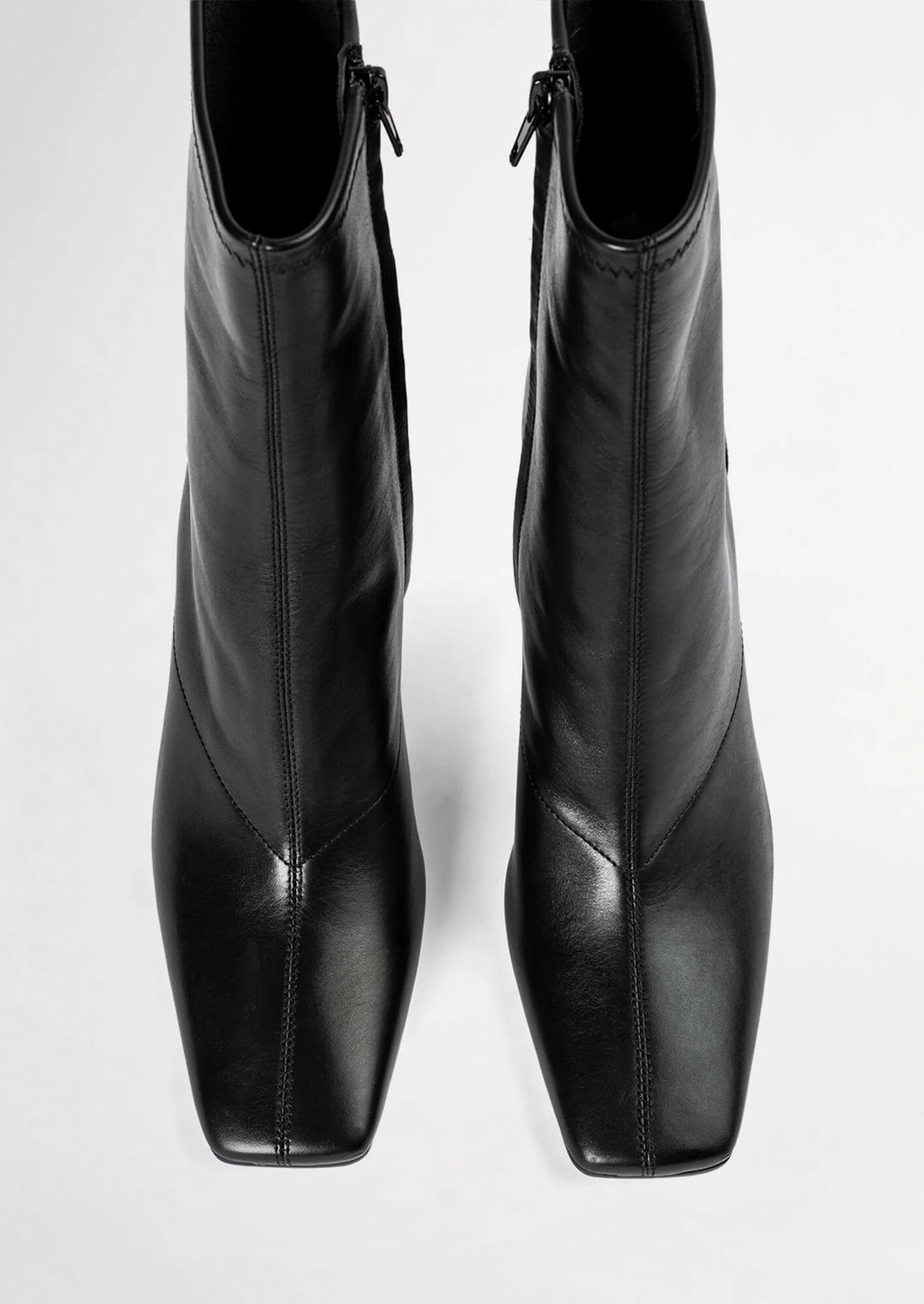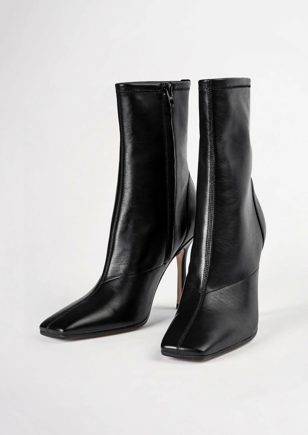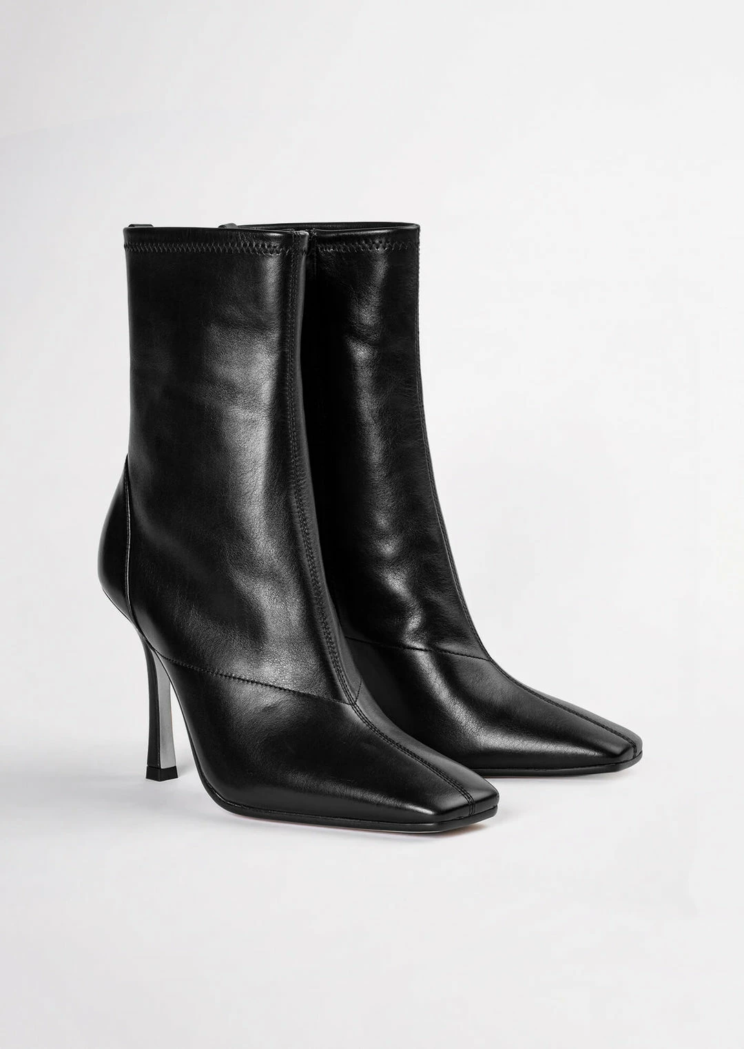 Fancy another little black boot? The Halsey ankle boot is not like the others! Boasting a soft black leather exterior, this bootie features an on-trend squared toe shape, a matching rear zip to the ankle for an easy, slip-on-and-go wear and is finished with a 10.5cm stiletto heel. Pair effortlessly with cropped denim jeans.