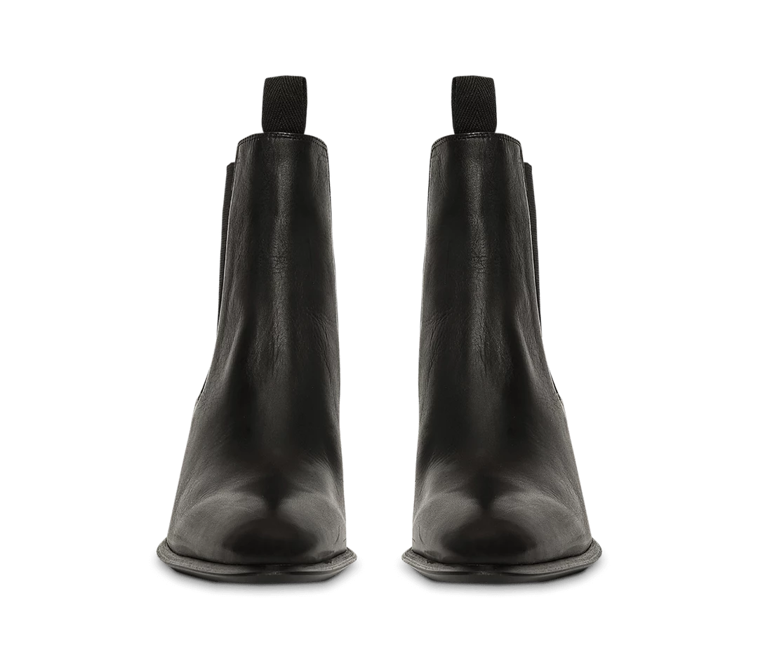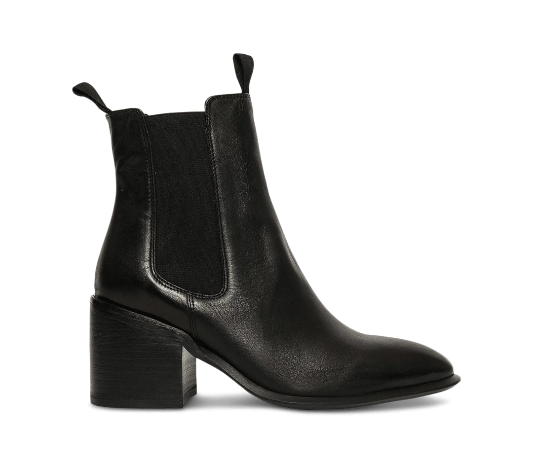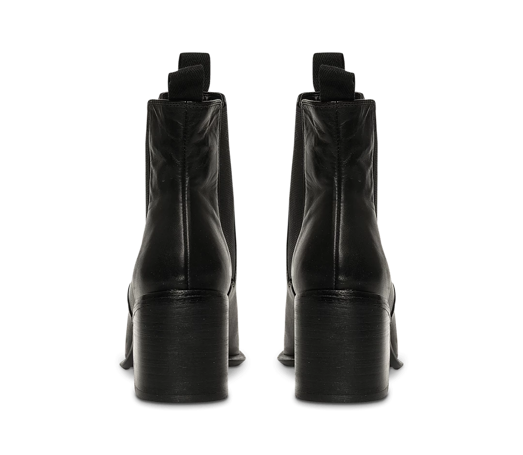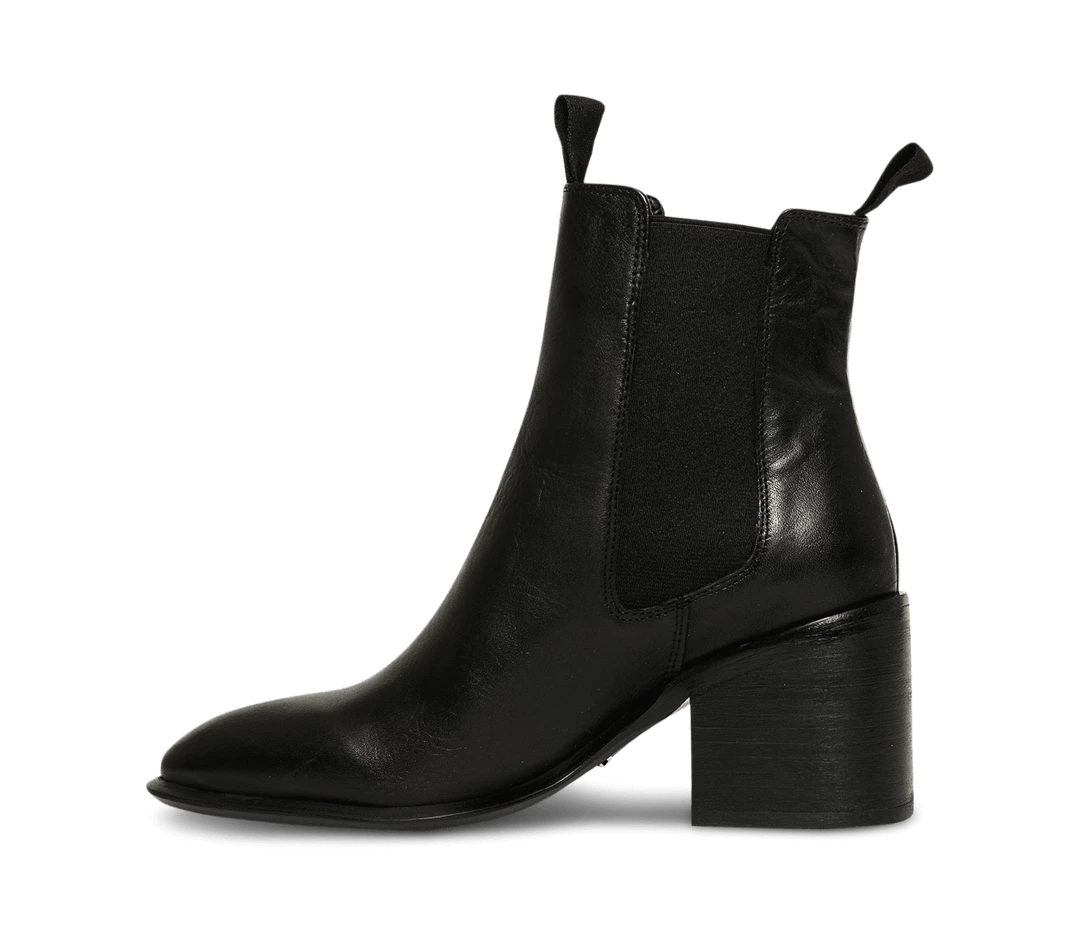A black leather ankle boot with an almond toe shape, side gussets and mid block heel.