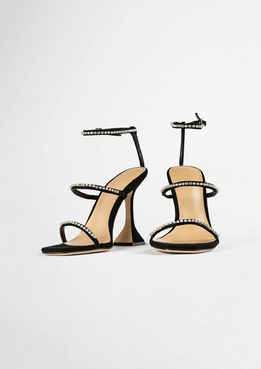Shy by name, but not by nature. Our Shy black suede strappy heels feature slender foot-framing straps lined with diamente detailing, an on-trend square toe shape and a flared hourglass shaped heel. Finished with a secure ankle buckle, pair with any outfit for the perfect finishing touch.
