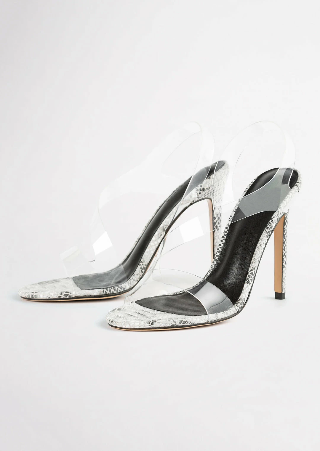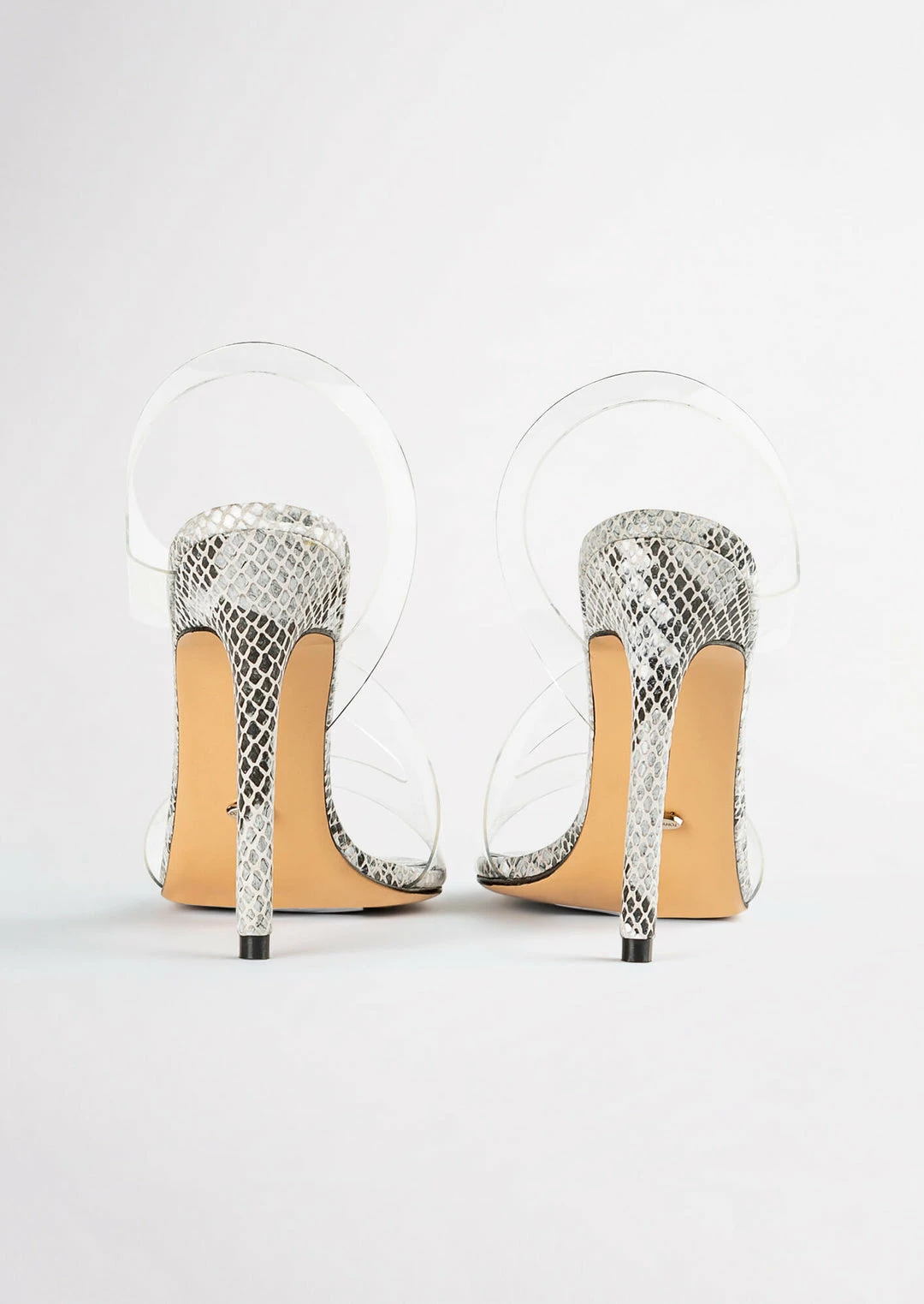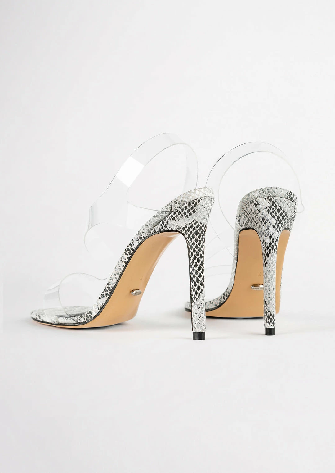 Unleash your wild side this season with our animal print Kaya vinylite heels. Designed with a clear see-through strap upper, this sling-back style features an aztec snake print leather sole. Finished with a slender stiletto heel and a sleek rounded toe-shape.