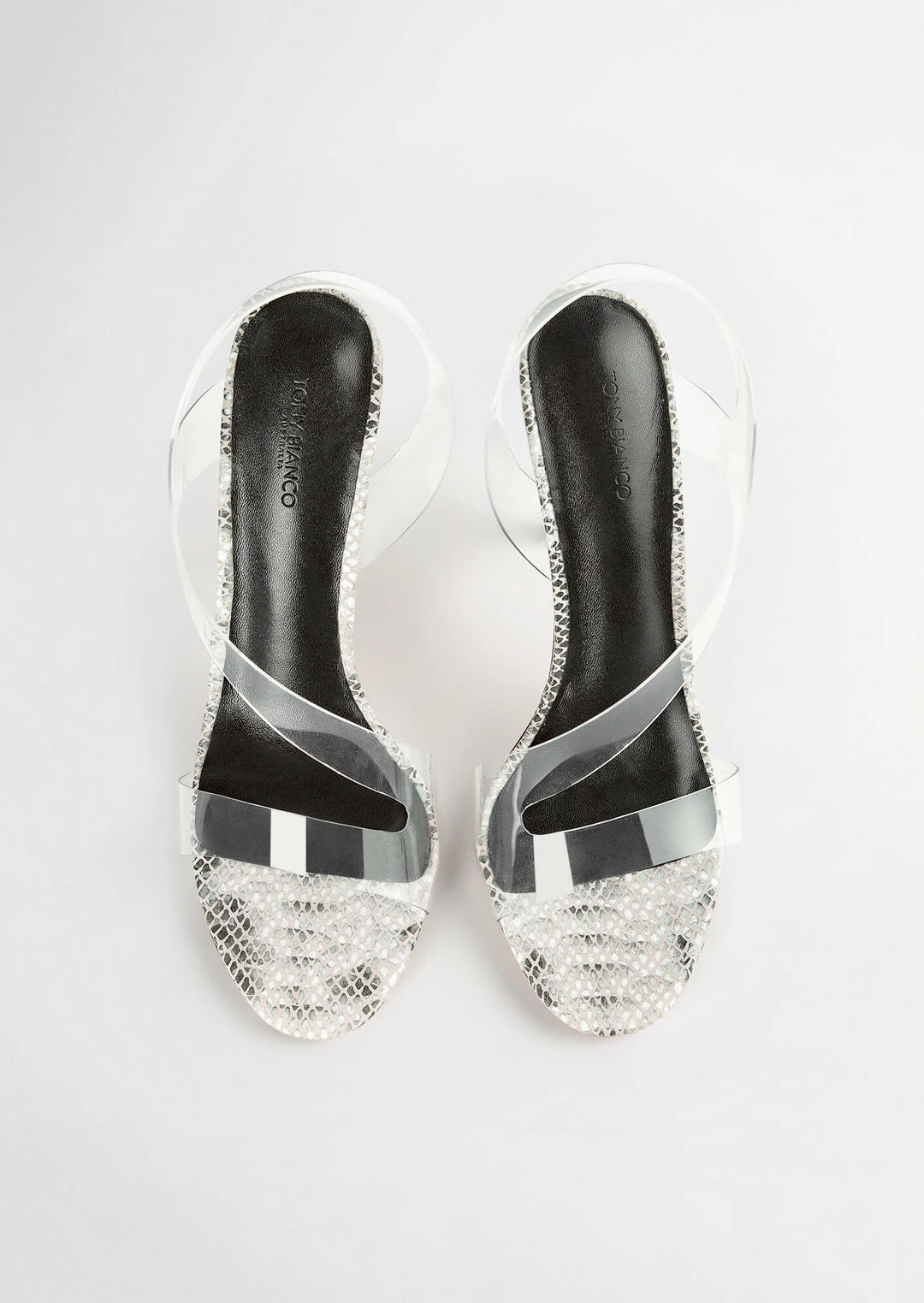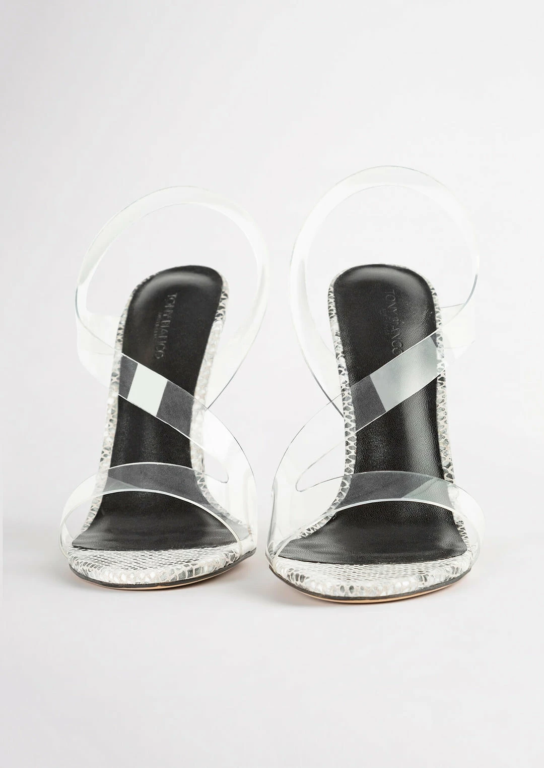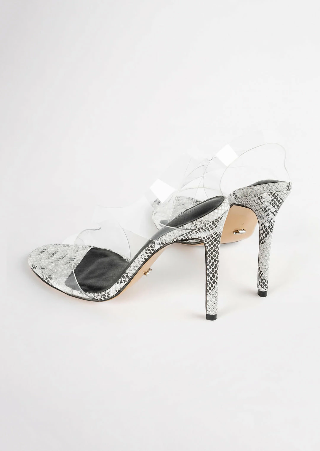 Unleash your wild side this season with our animal print Kaya vinylite heels. Designed with a clear see-through strap upper, this sling-back style features an aztec snake print leather sole. Finished with a slender stiletto heel and a sleek rounded toe-shape.