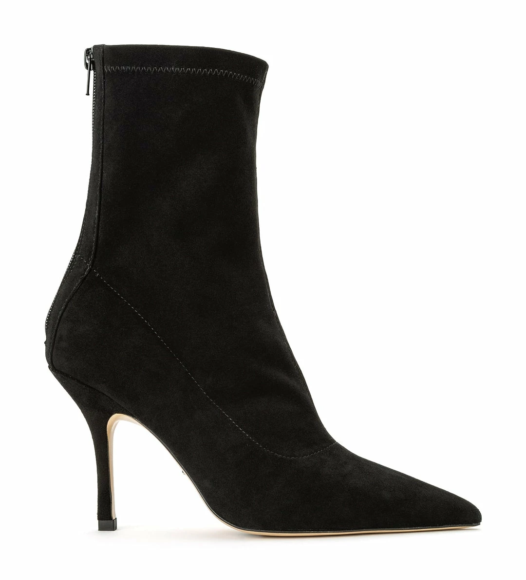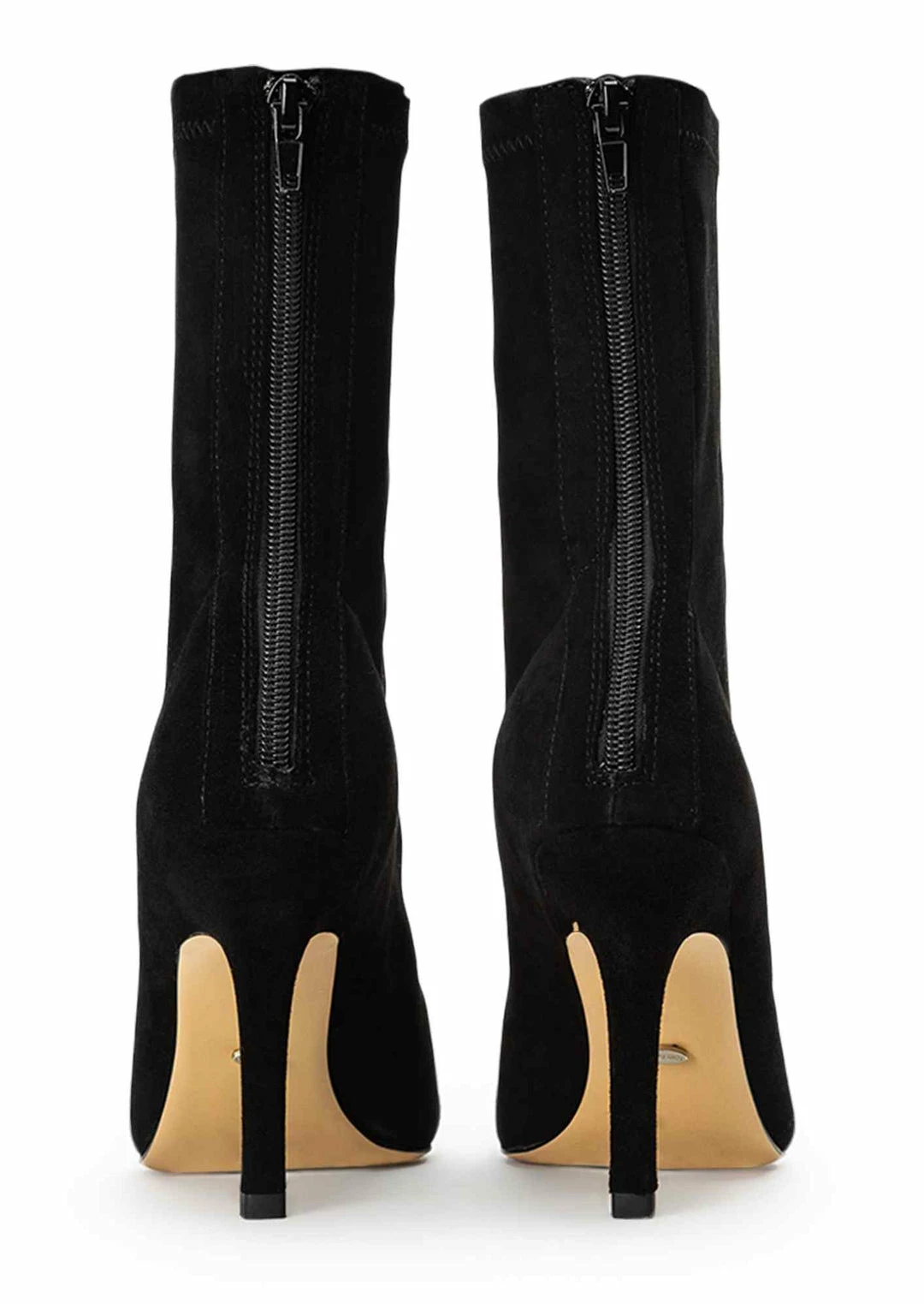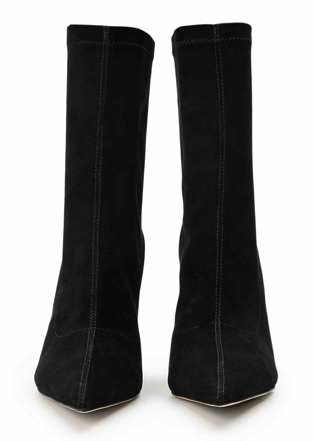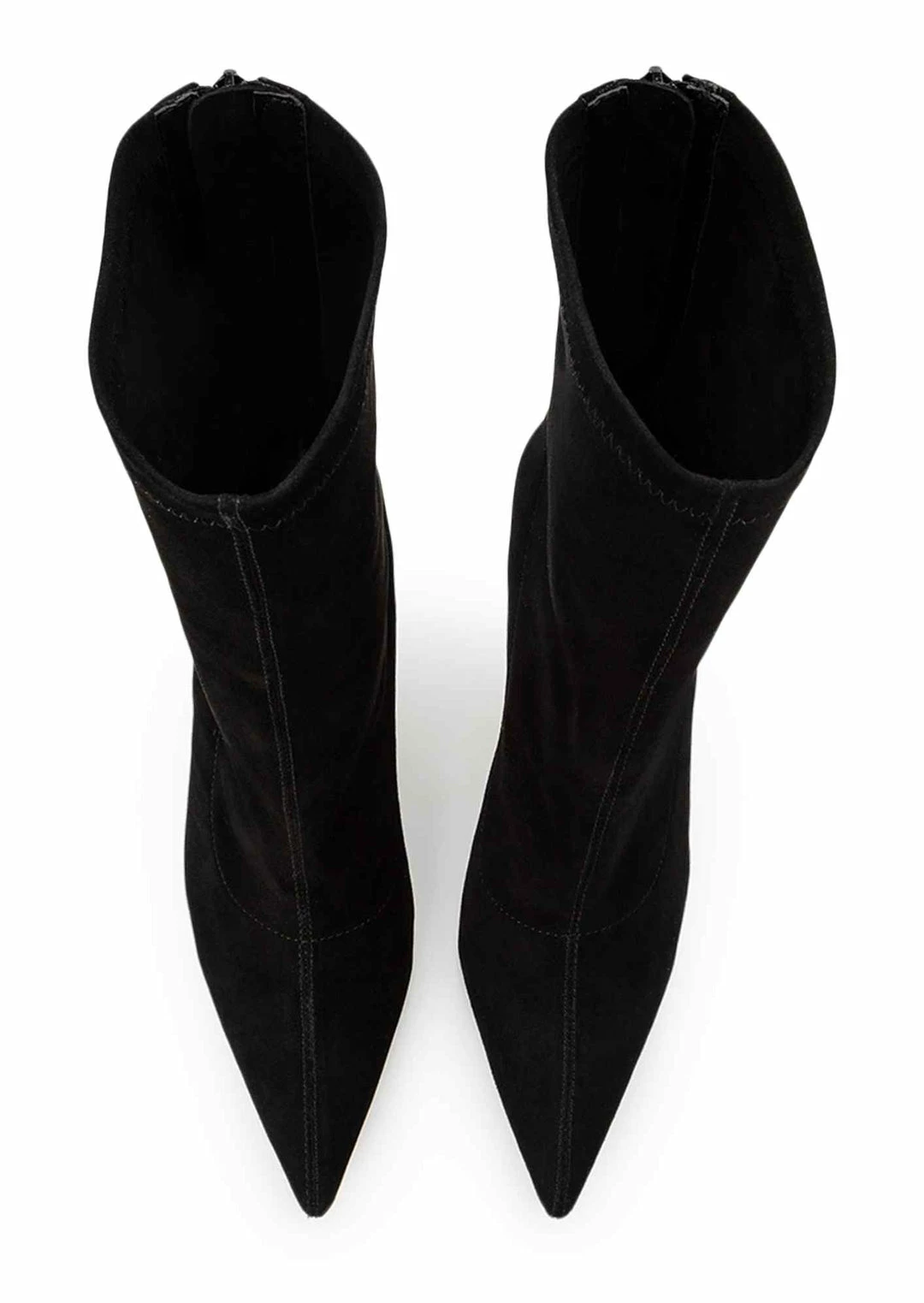 Your search for a dressy black suede ankle boot is over! Our Kitty black stretch suede boot features a pointed toe-shape, a medium height stiletto heel and a centred zip to the back to easy slip on and go.
