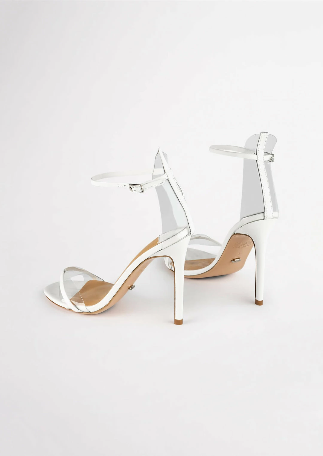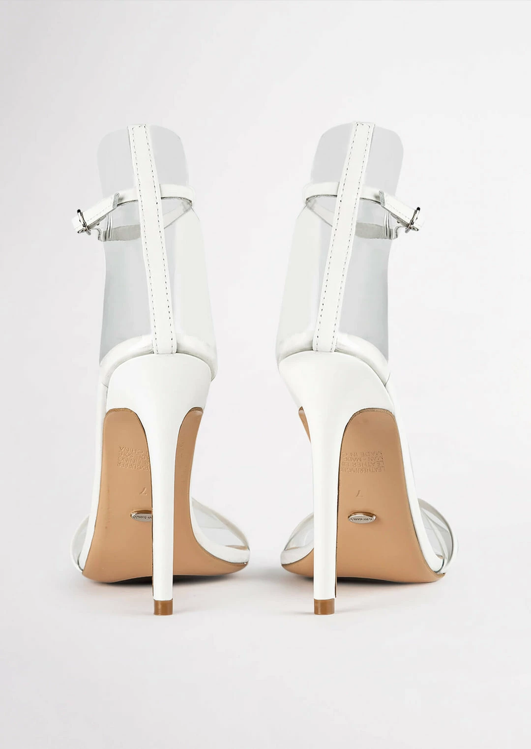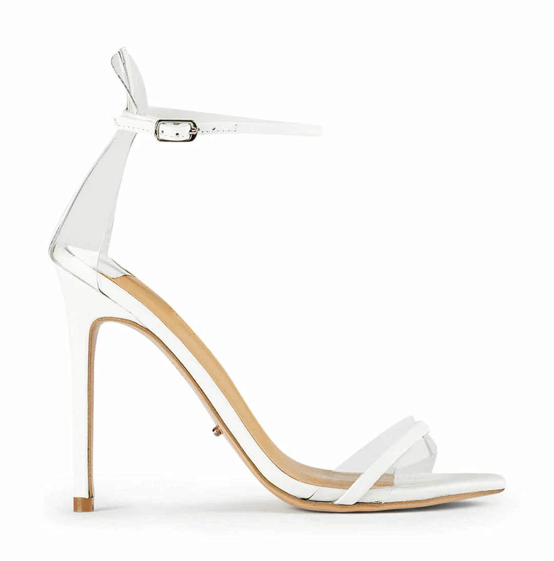 A white leather open toe dress sandal with a stiletto heel with a leather and clear two strap upper. – Combination leather and synthetic upper – Synthetic lining – White shade – Stiletto heel – Adjustable ankle strap – Clear feature at front and heel Heel Height: 11cm