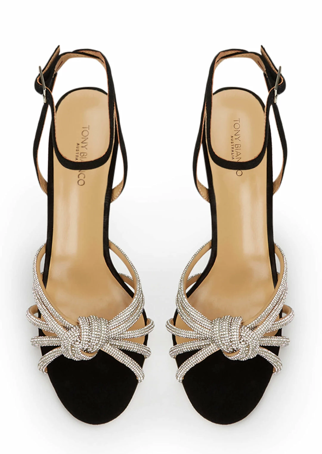 Tie the knot with the embellished Kyla black stiletto heels. With an interlocking diamante encrusted upper, stiletto heel and barely-there ankle strap, this can be your next bling fling.