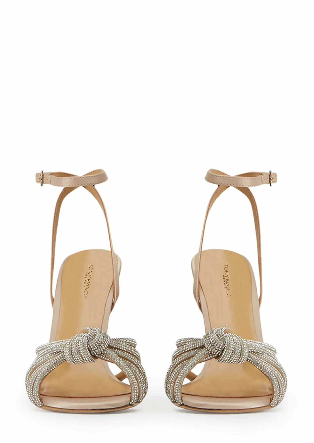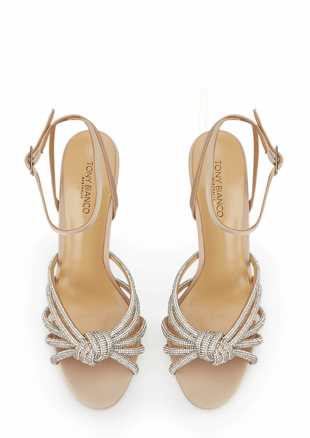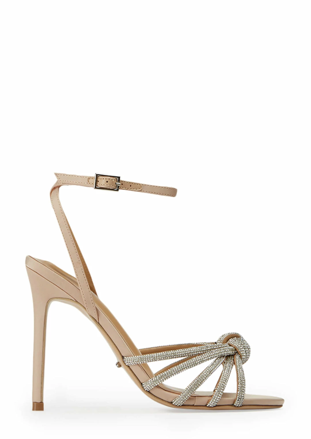 Tie the knot with the embellished Kyla tonal stiletto heels. With an interlocking diamante encrusted upper, stiletto heel and barely-there ankle strap, this can be your next bling fling.