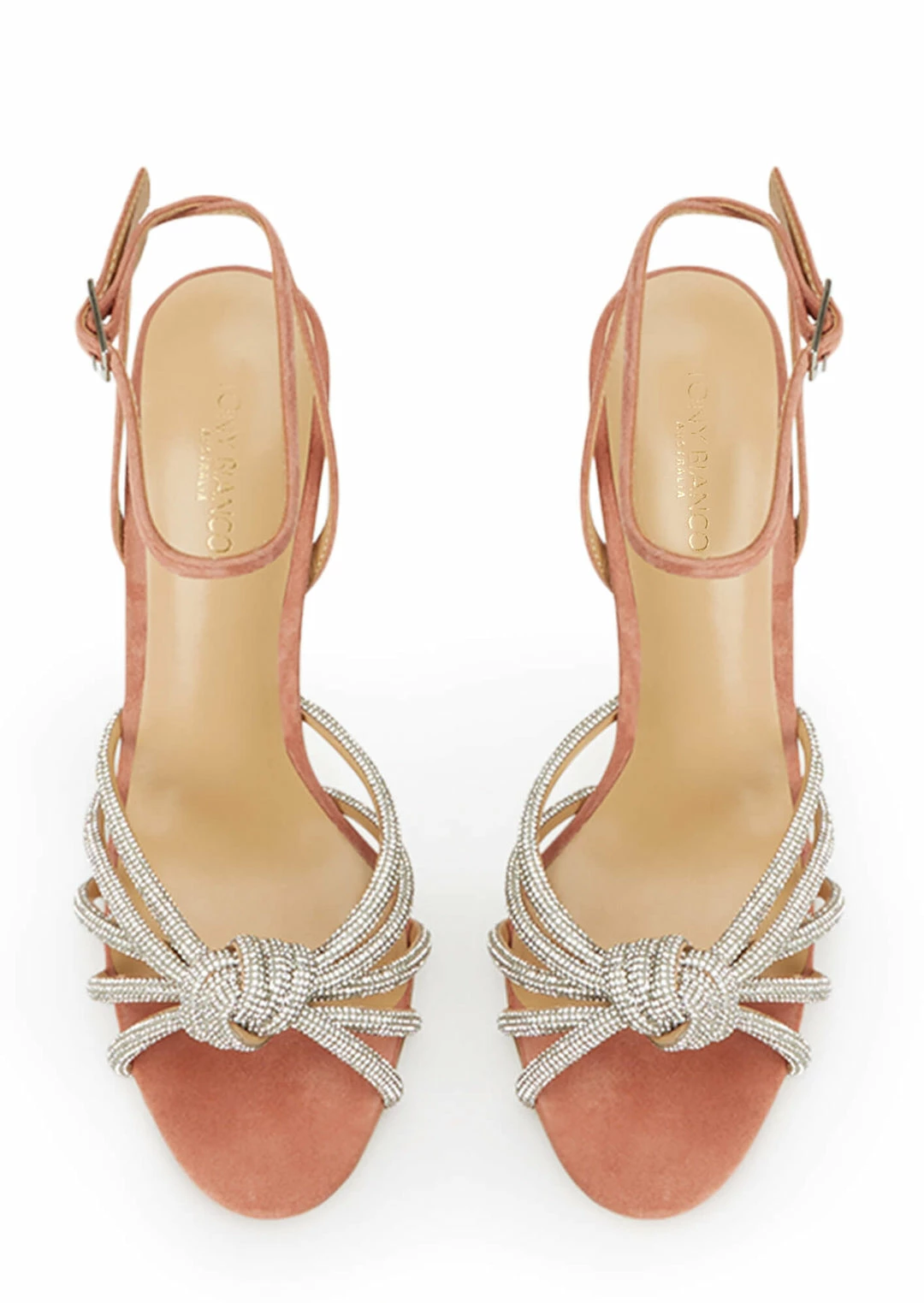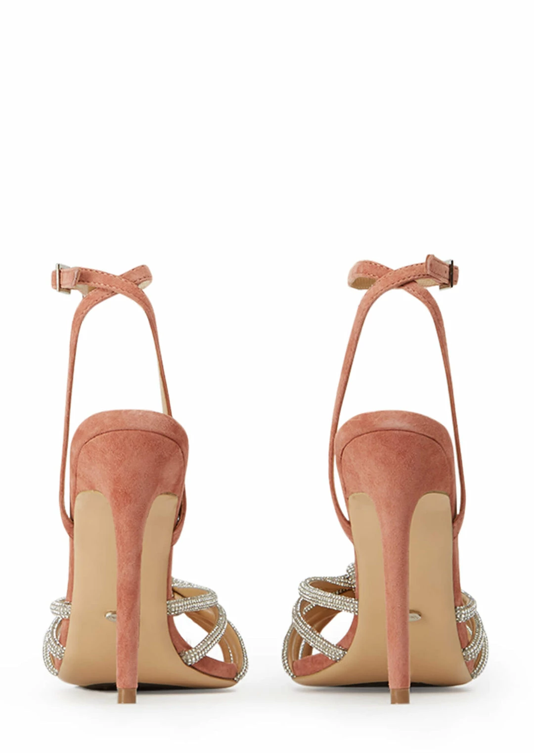 Tie the knot with the embellished Kyla rose pink stiletto heels. With an interlocking diamante encrusted upper, stiletto heel and barely-there ankle strap, this can be your next bling fling.