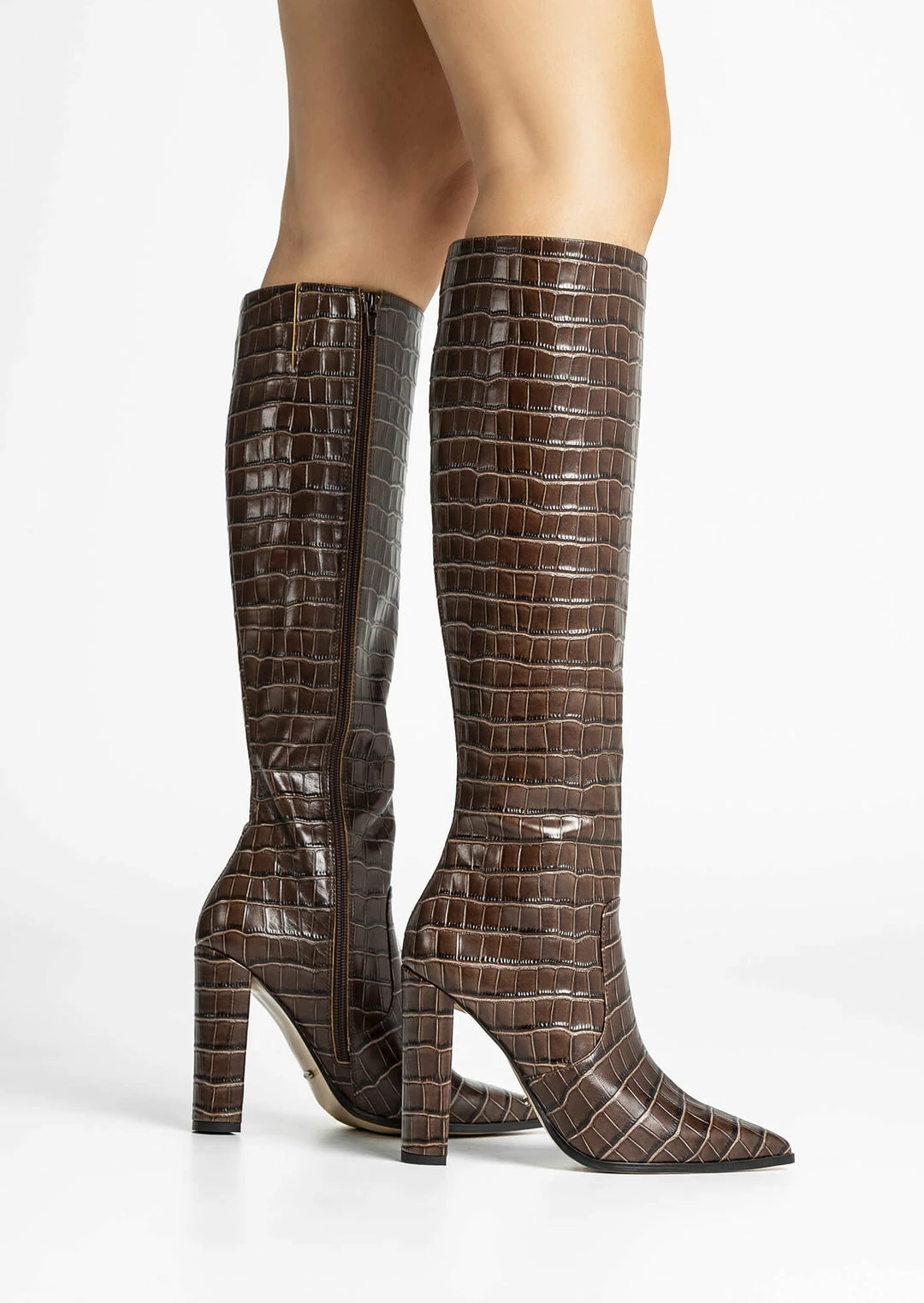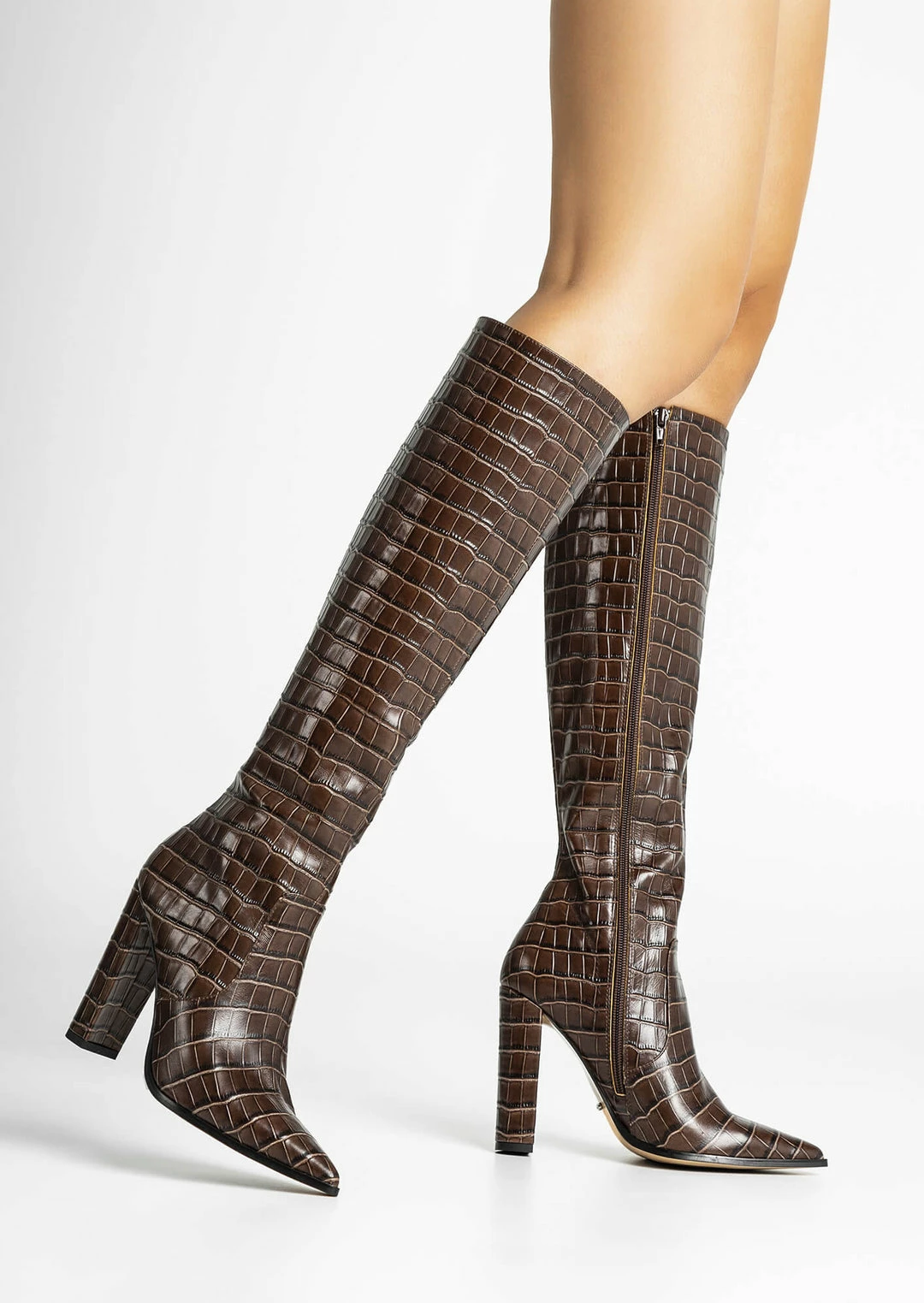 Get ready to fall in love with the subtle slouch of the Lucille boots. Crafted with a genuine brown croc printed leather this stylish knee-high boot features a pointed toe and pairs perfectly with midi dresses or skirts.