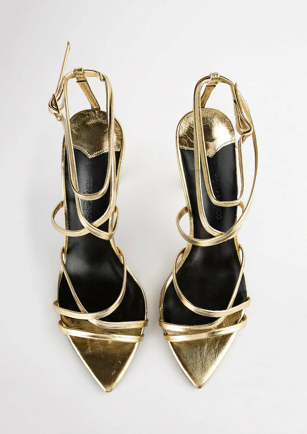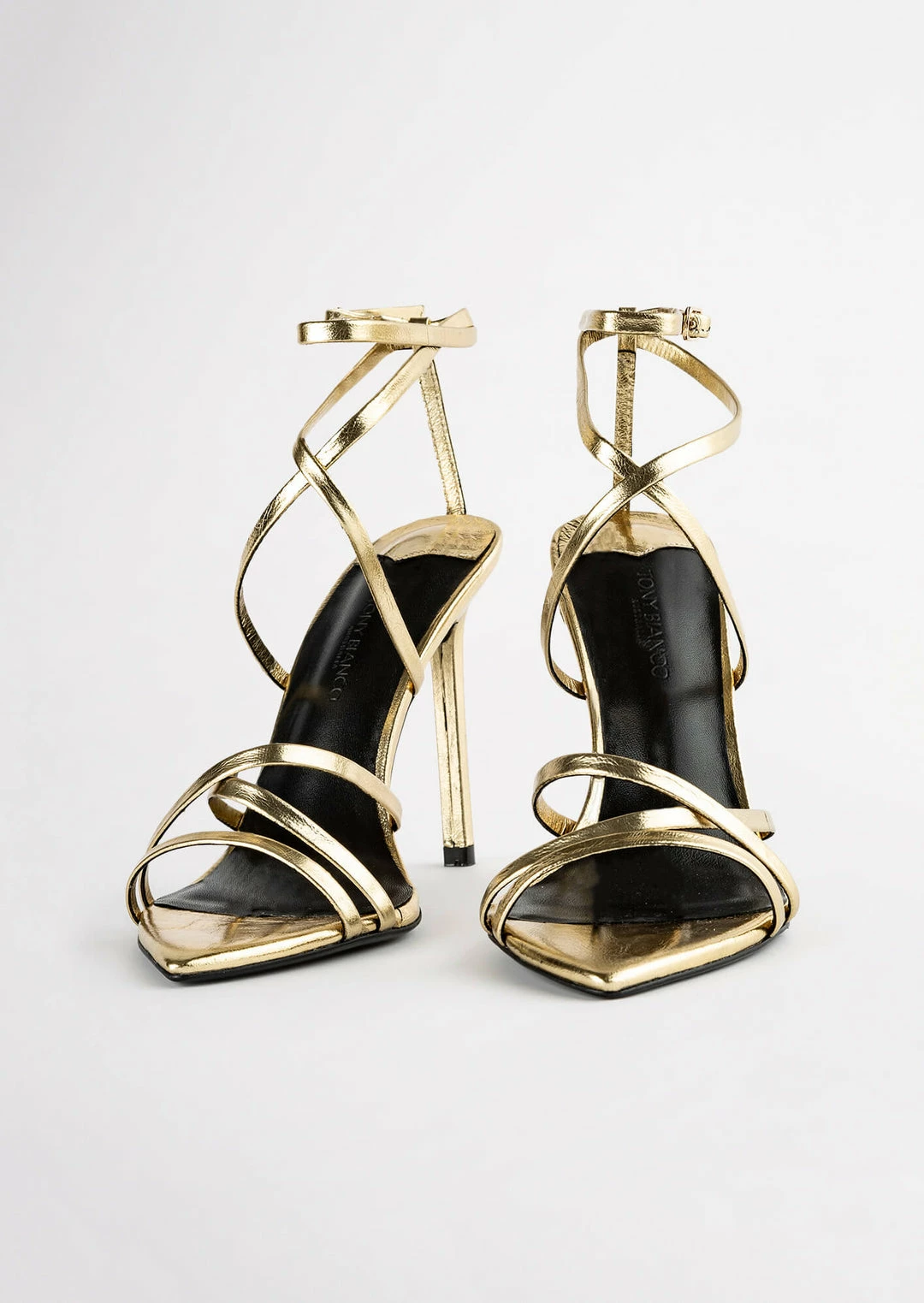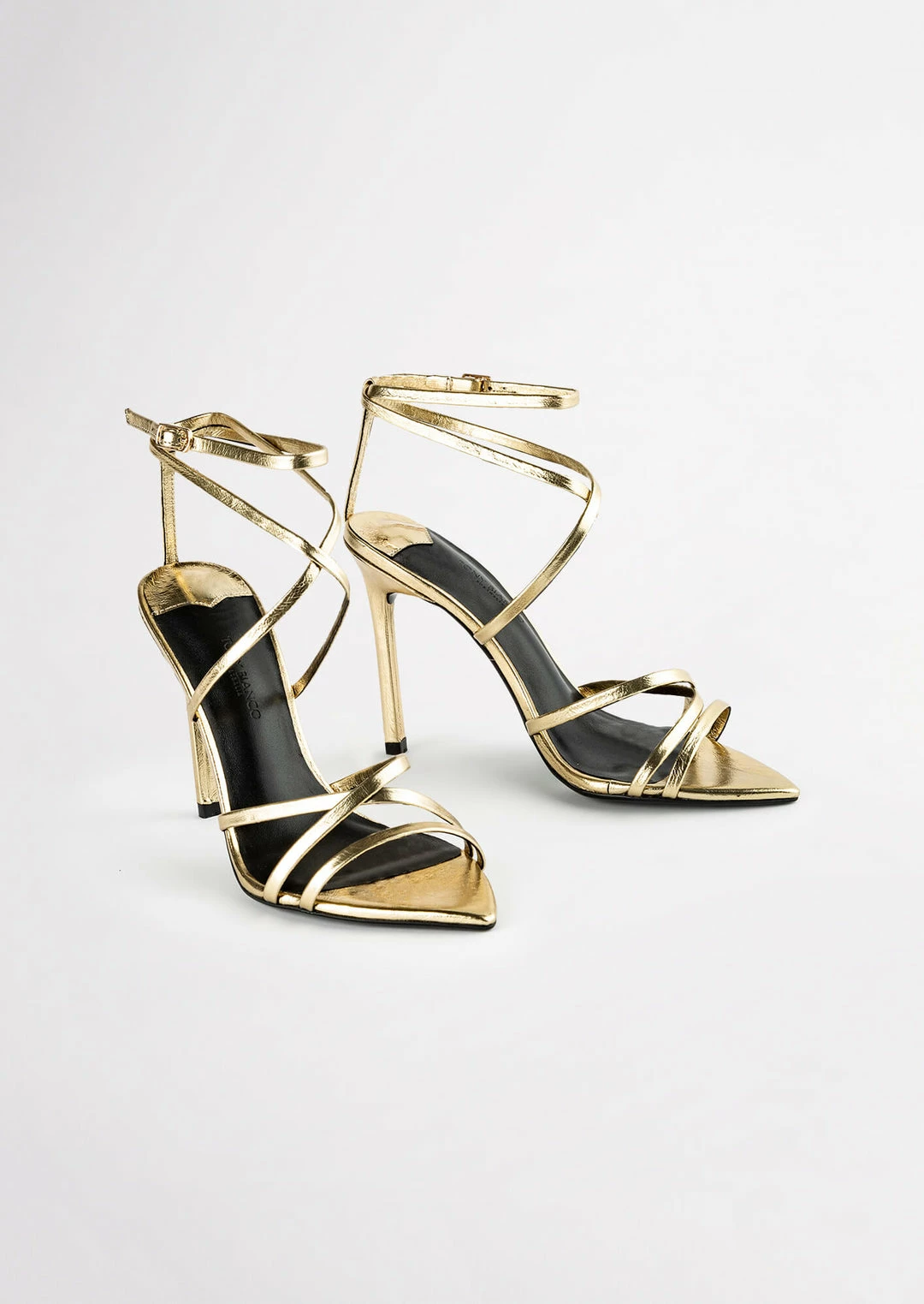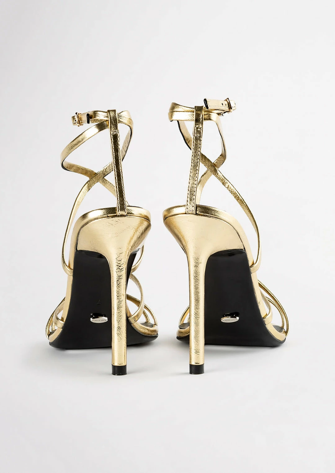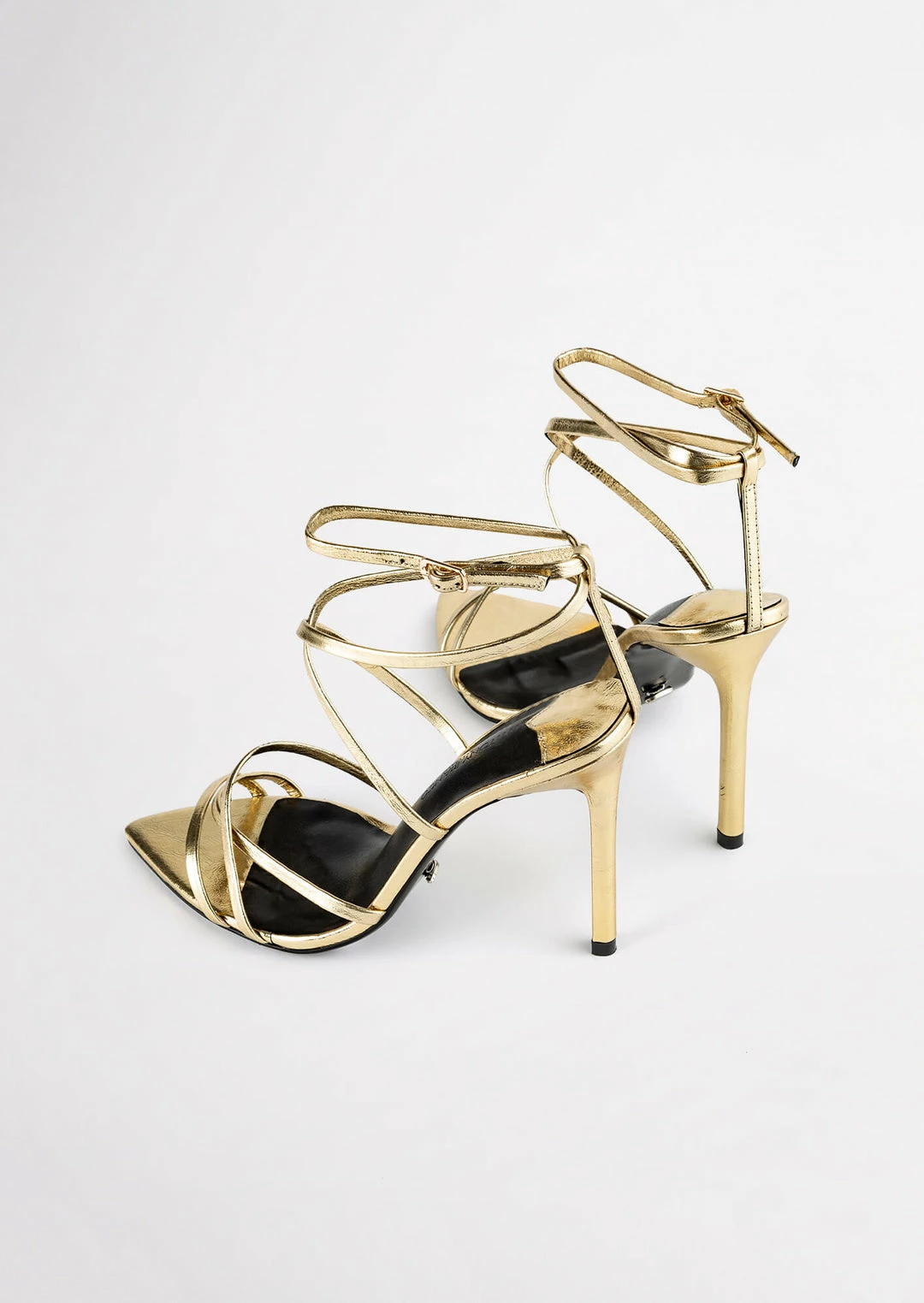 The gold Marcy stiletto heel features a pointed open toe shape with slender multiple cross over straps and adjustable ankle buckle.