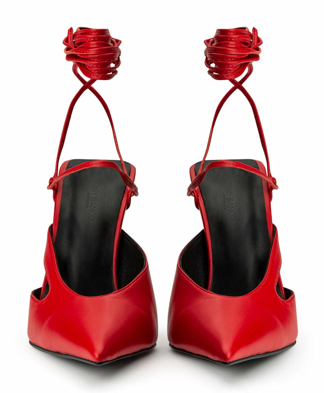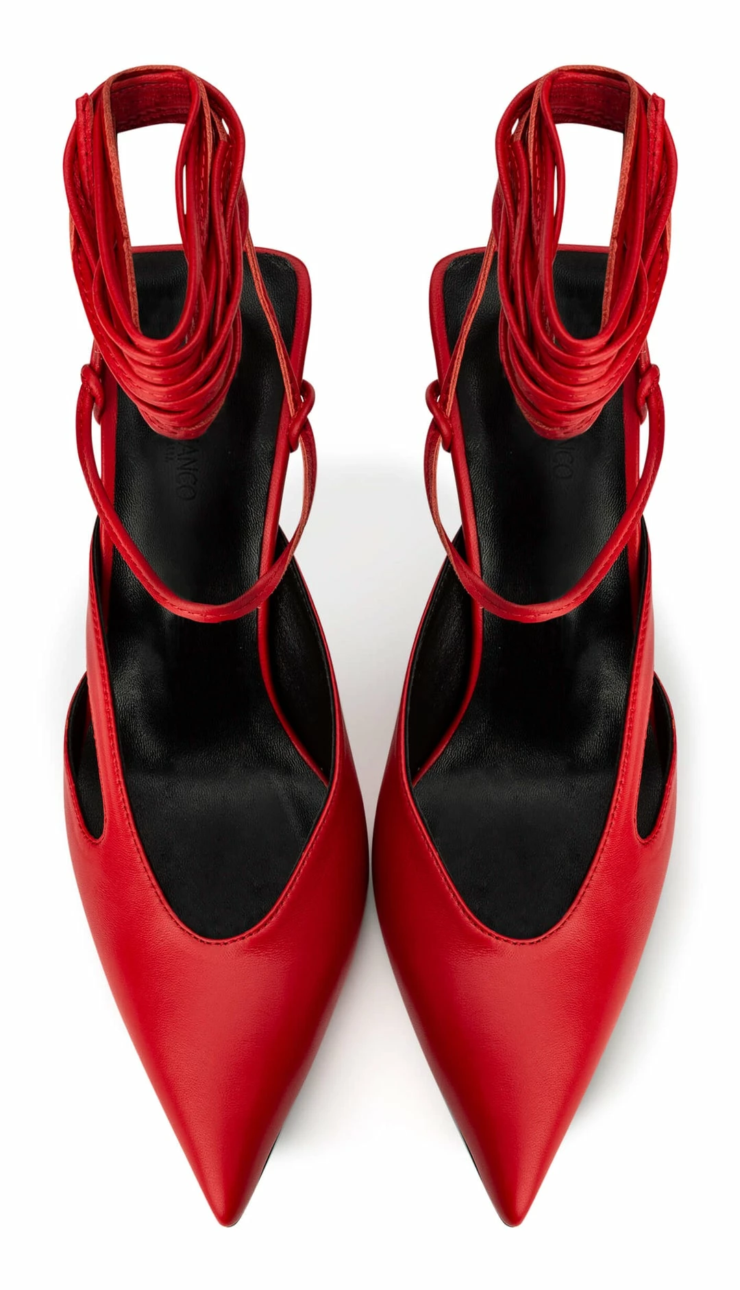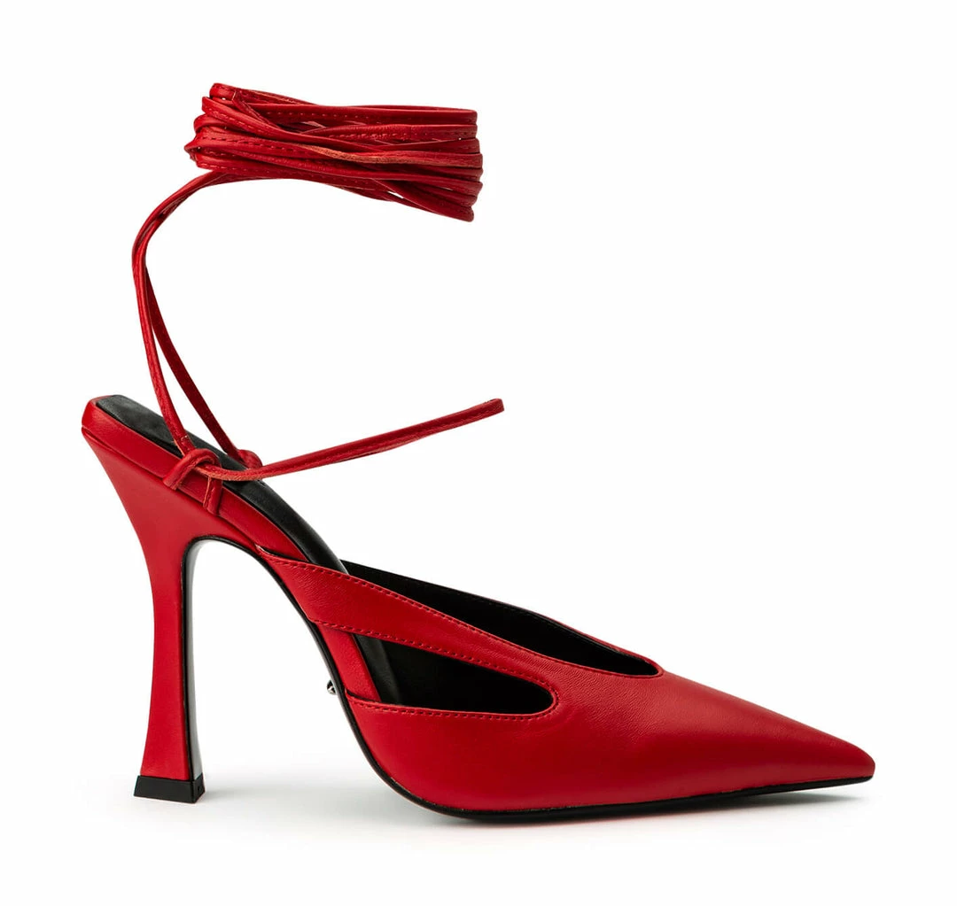Say hello to the Passion red leather pumps, here to shake up the world of women’s court shoes. A truly show stopping pump shoe featuring a sleek pointed toe shape, a flattering side cut-out and a wrap-around ankle strap. Finished with a tall stiletto heel.