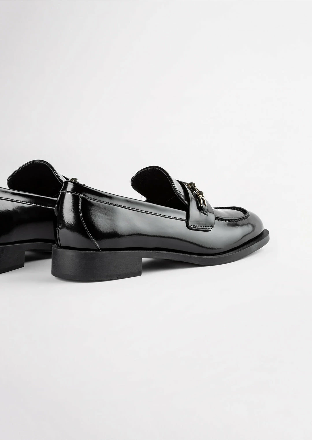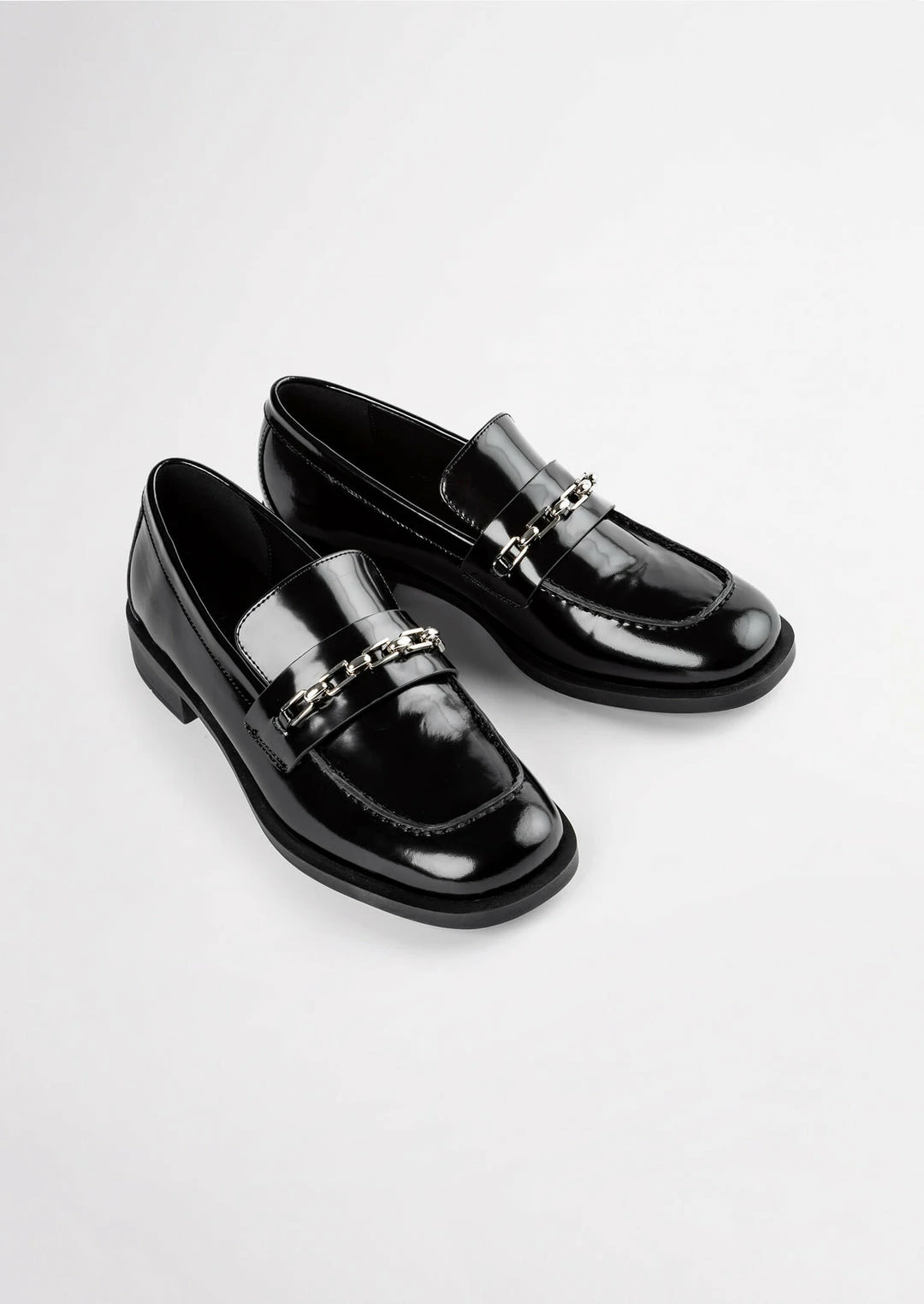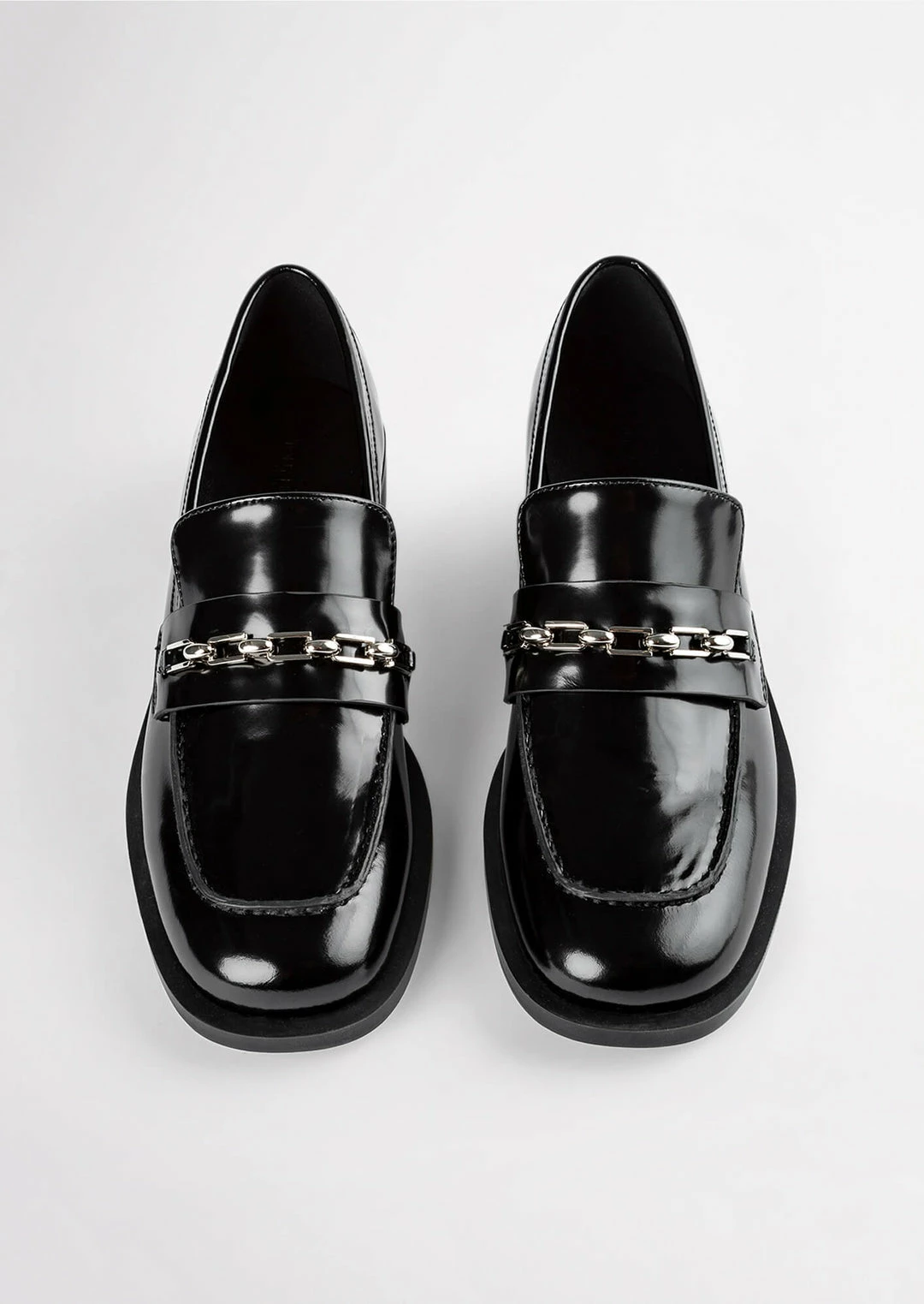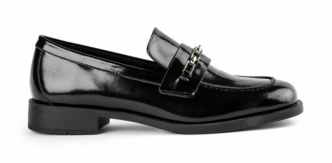It’s a *loafer* world and we’re just living in it. The Rebecca flat loafer features a premium black patent exterior with a subtle stitch detailing, a high-cut vamp and delicate chain detailing. Finished with an exposed sole and a short 2.5cm flat sole.