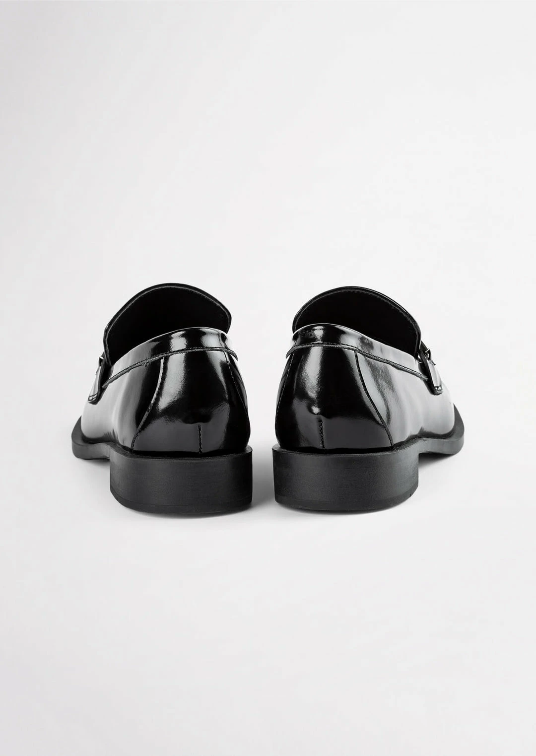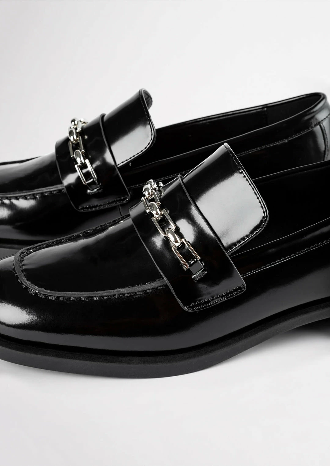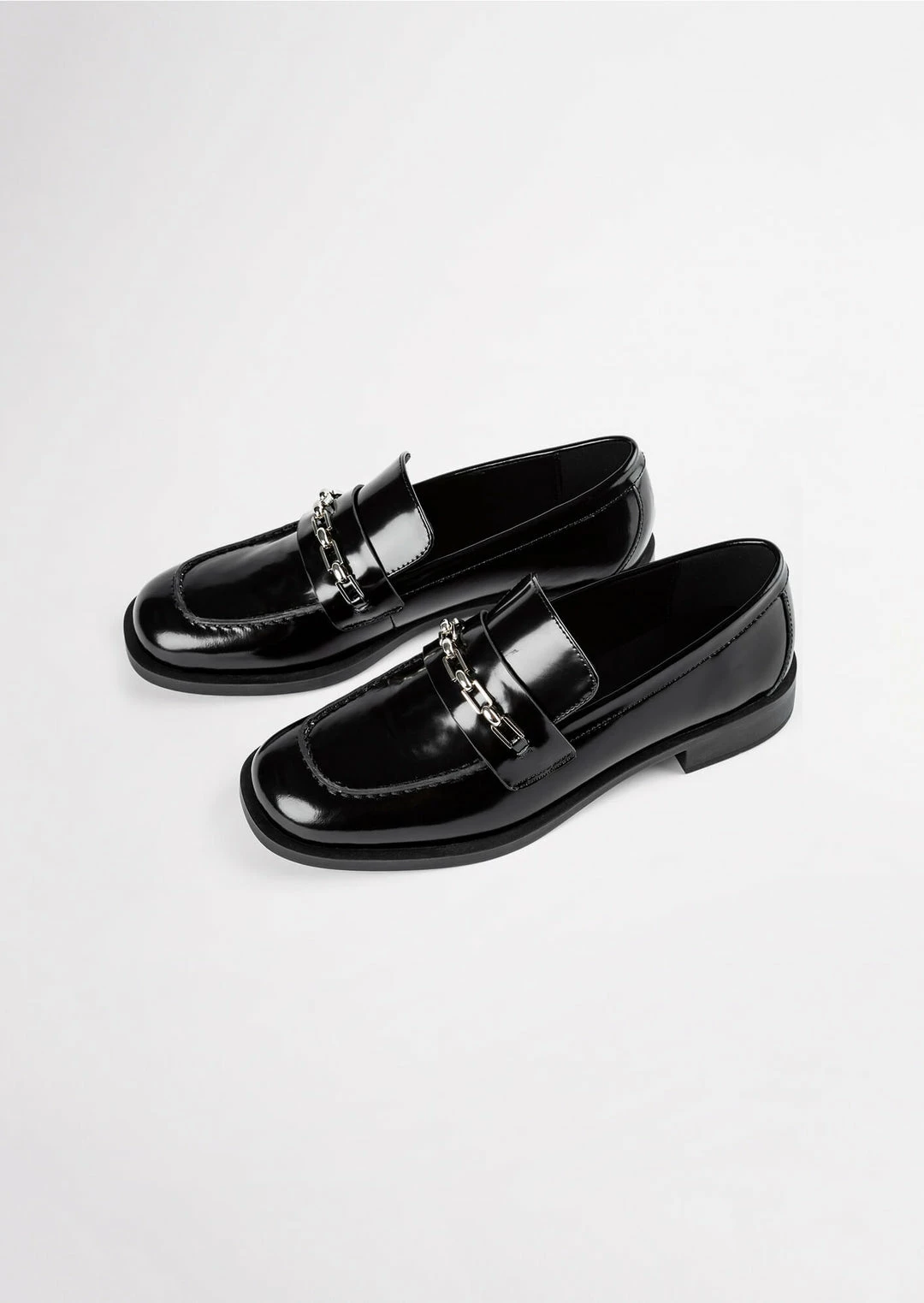 It’s a *loafer* world and we’re just living in it. The Rebecca flat loafer features a premium black patent exterior with a subtle stitch detailing, a high-cut vamp and delicate chain detailing. Finished with an exposed sole and a short 2.5cm flat sole.