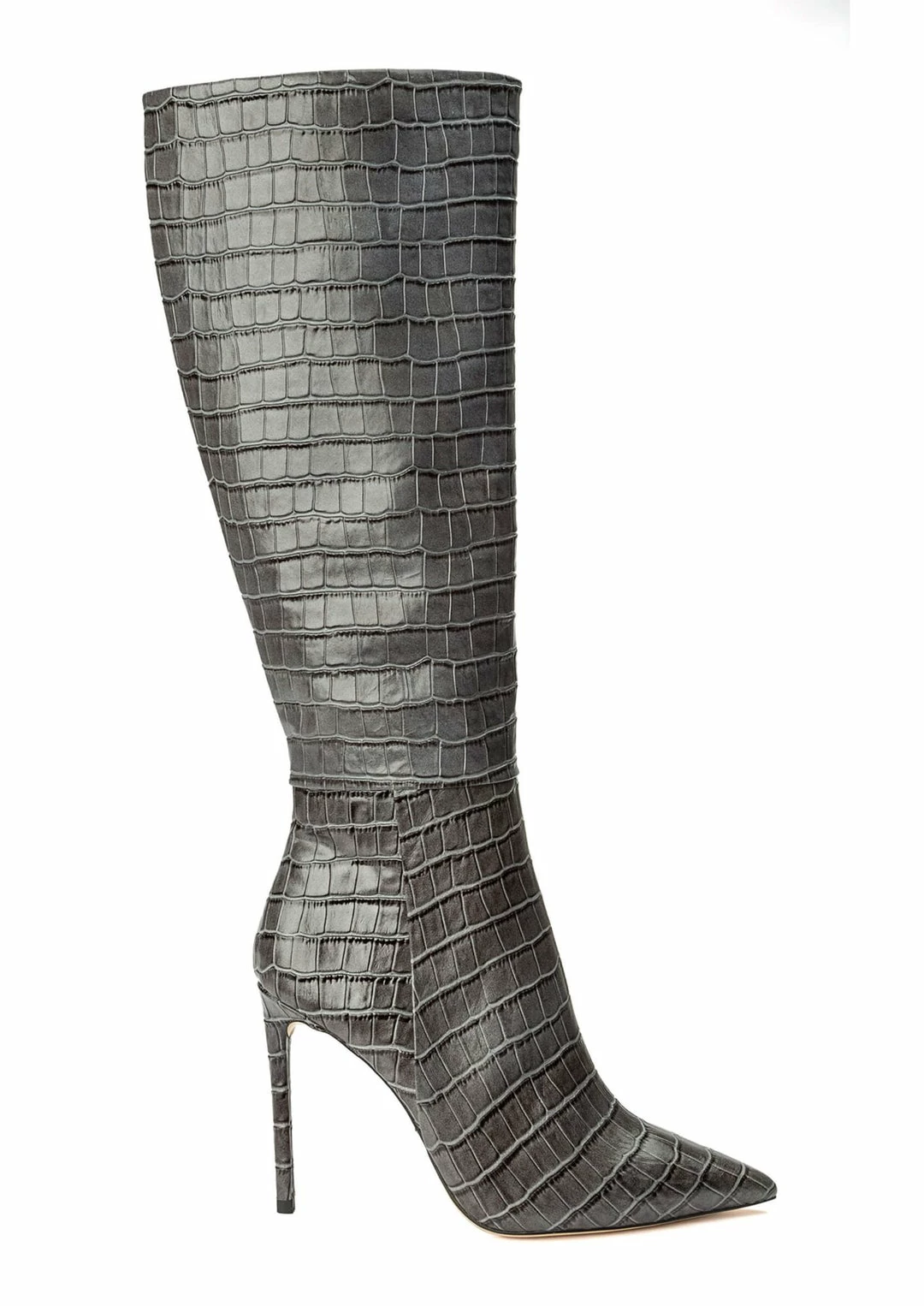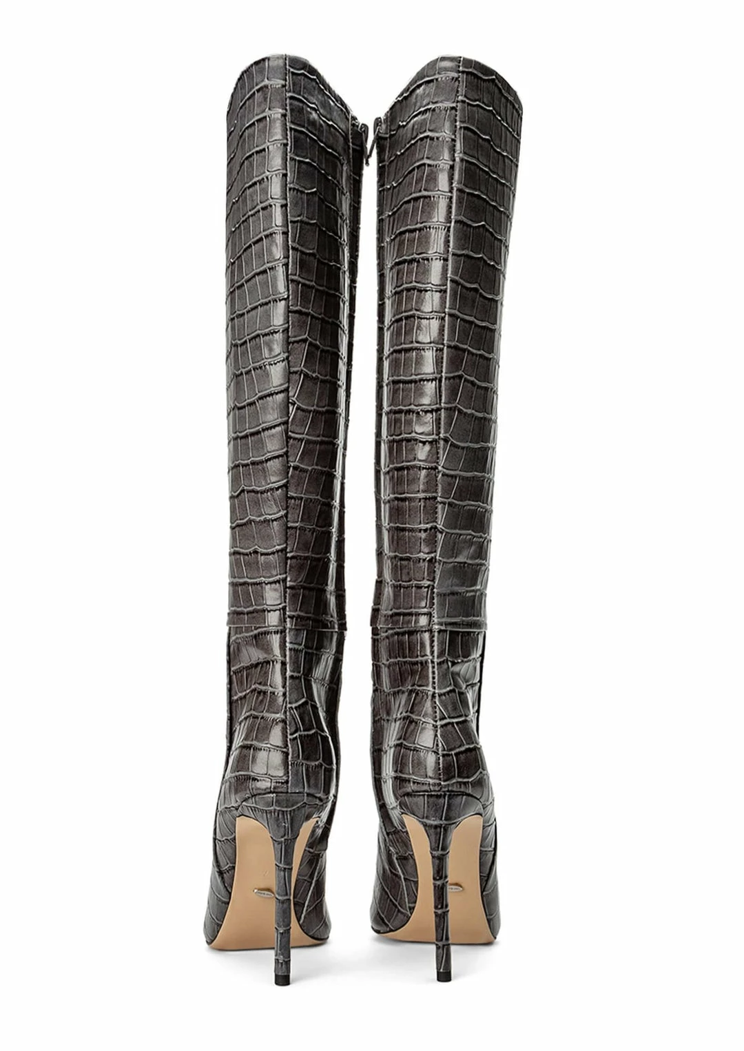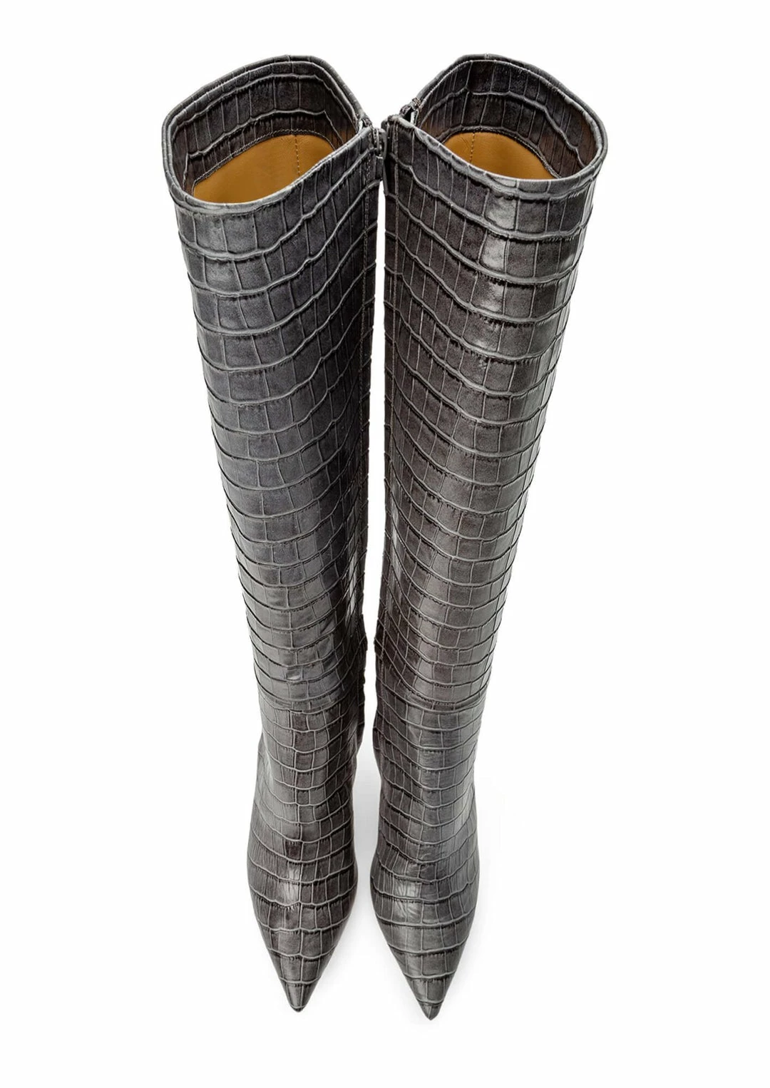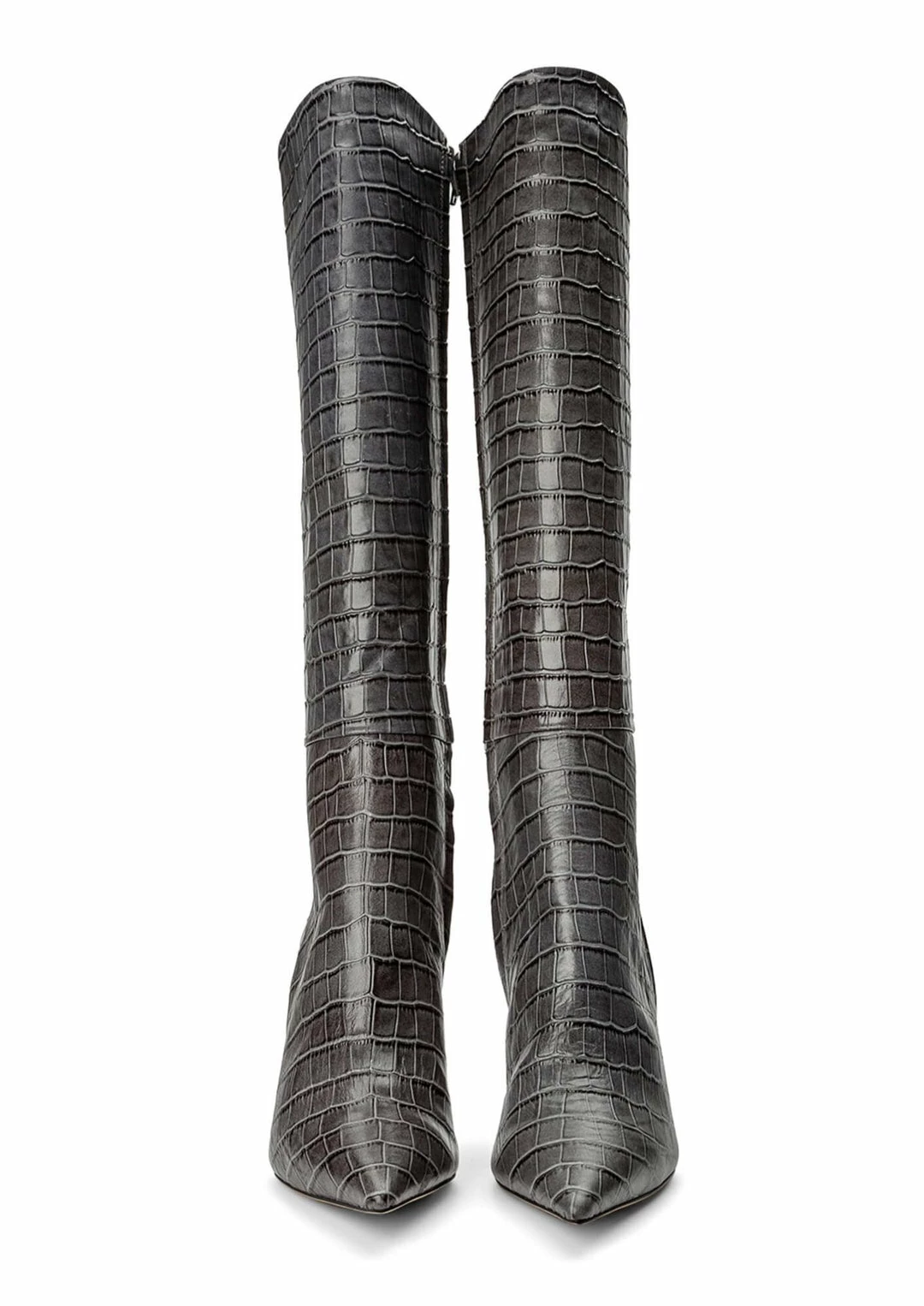You can’t go wrong with a leather knee high boot for winter! Our Apollo grey croc knee boot features a classic shape with a pointed toe design, a high stiletto heel and a full length zip for an easy wear.