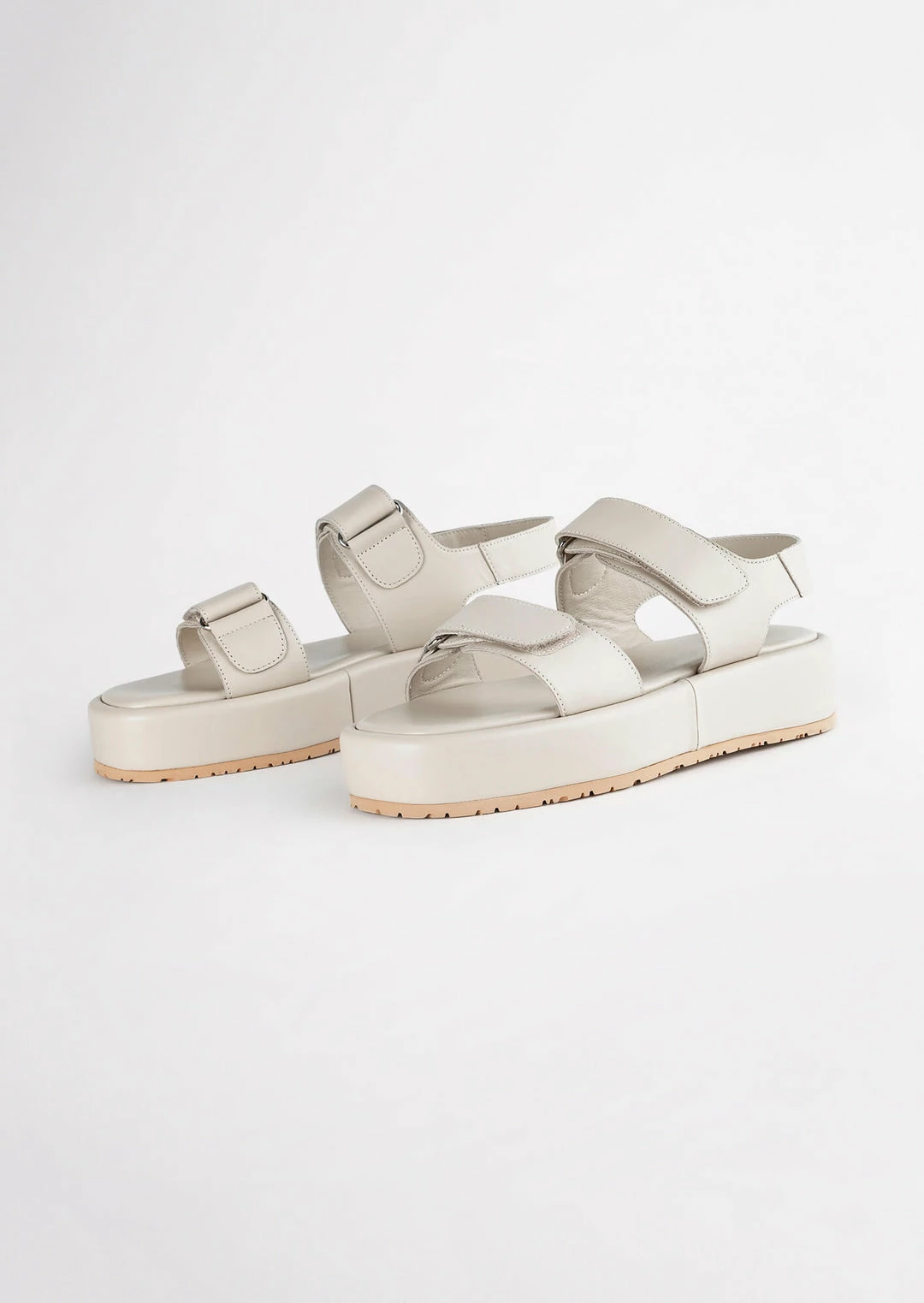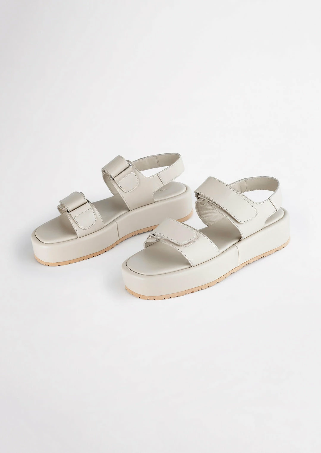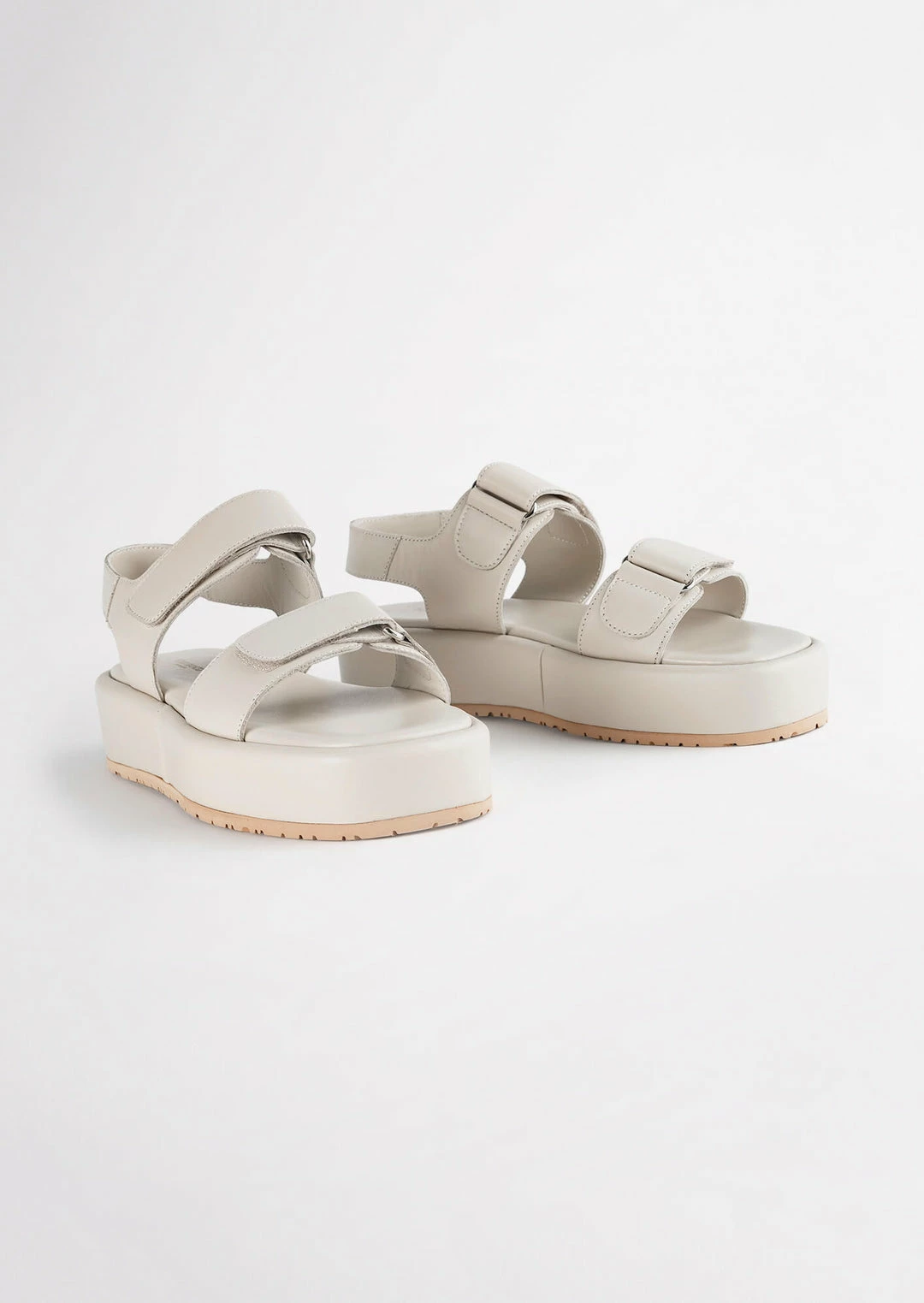 Update your Summer style with the Chevy sandal in off-white genuine leather. Featuring a platform sole with a simple velcro two strap design, you’ll be reaching for them time and time again.