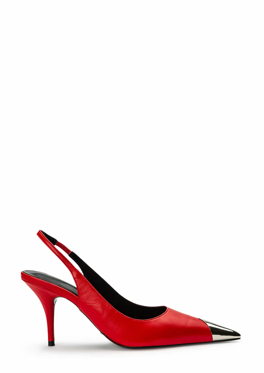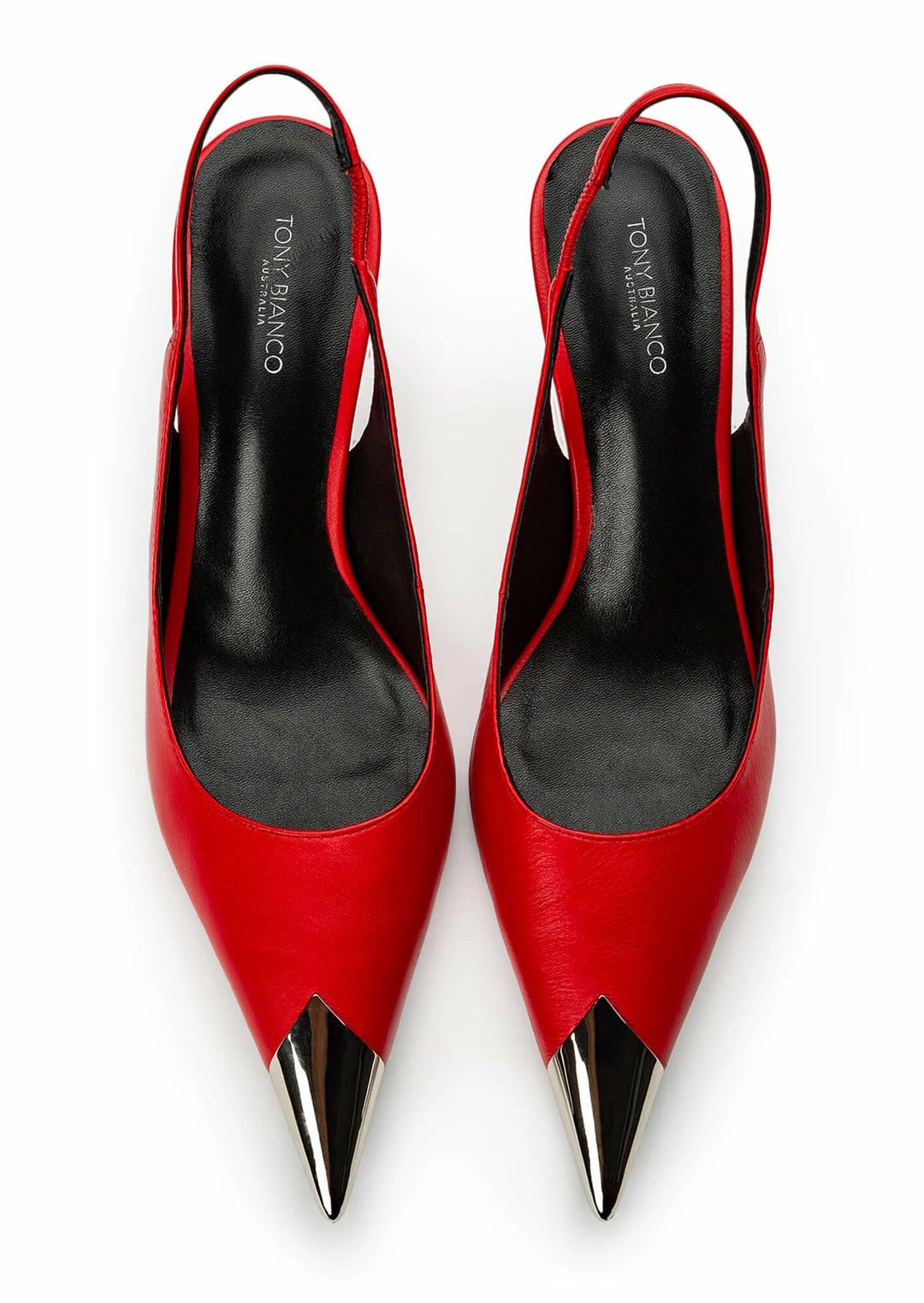 It’s straight to the point with Hope our new classic red sling-back pump. Showcasing an elasticated leather strap, lower kitten heel and edgy metal capped toe, she’s ready to complete your collection.