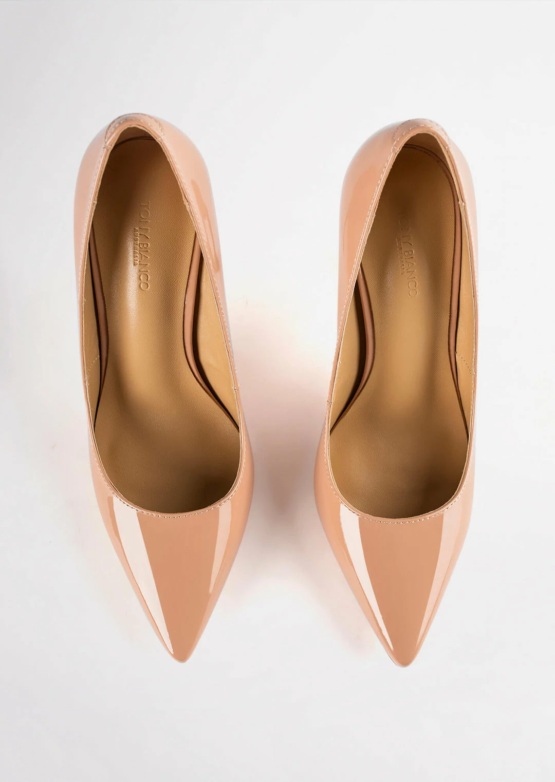 A classic nude patent pointed toe pump with a slender stiletto heel. – Leather upper and lining – Pointed toe shape – Stiletto heel Heel Height: 10.3cm