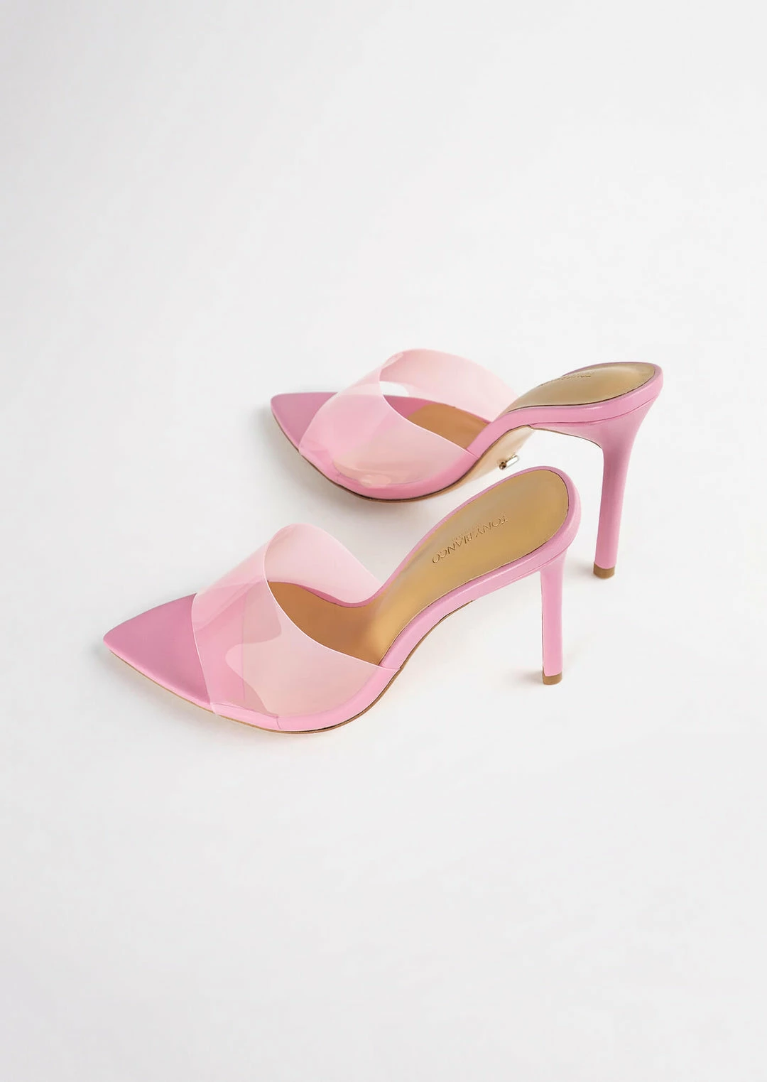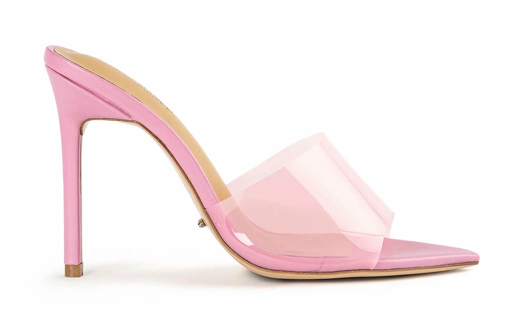 Point yourself in the right direction with our Marley vynalite mules. Pointed to perfection, this heeled mule showcases a transparent pink upper with a quality leather lining and comfortably cushioned sole. Finished with a leg-lengthening 10.5cm stiletto heel for the ultimate win.